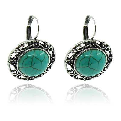Эффектные серьги с круглыми вставками из бирюзы (имитация) в витой оправе добавят изыска Вашему образу. Диаметр серьги 25мм, камня 17мм.