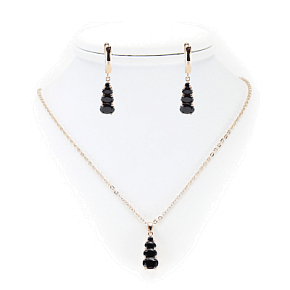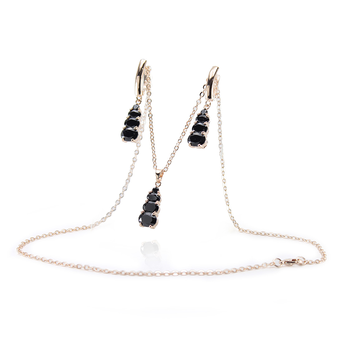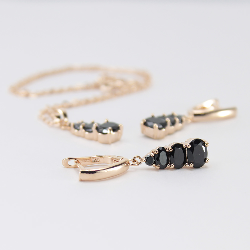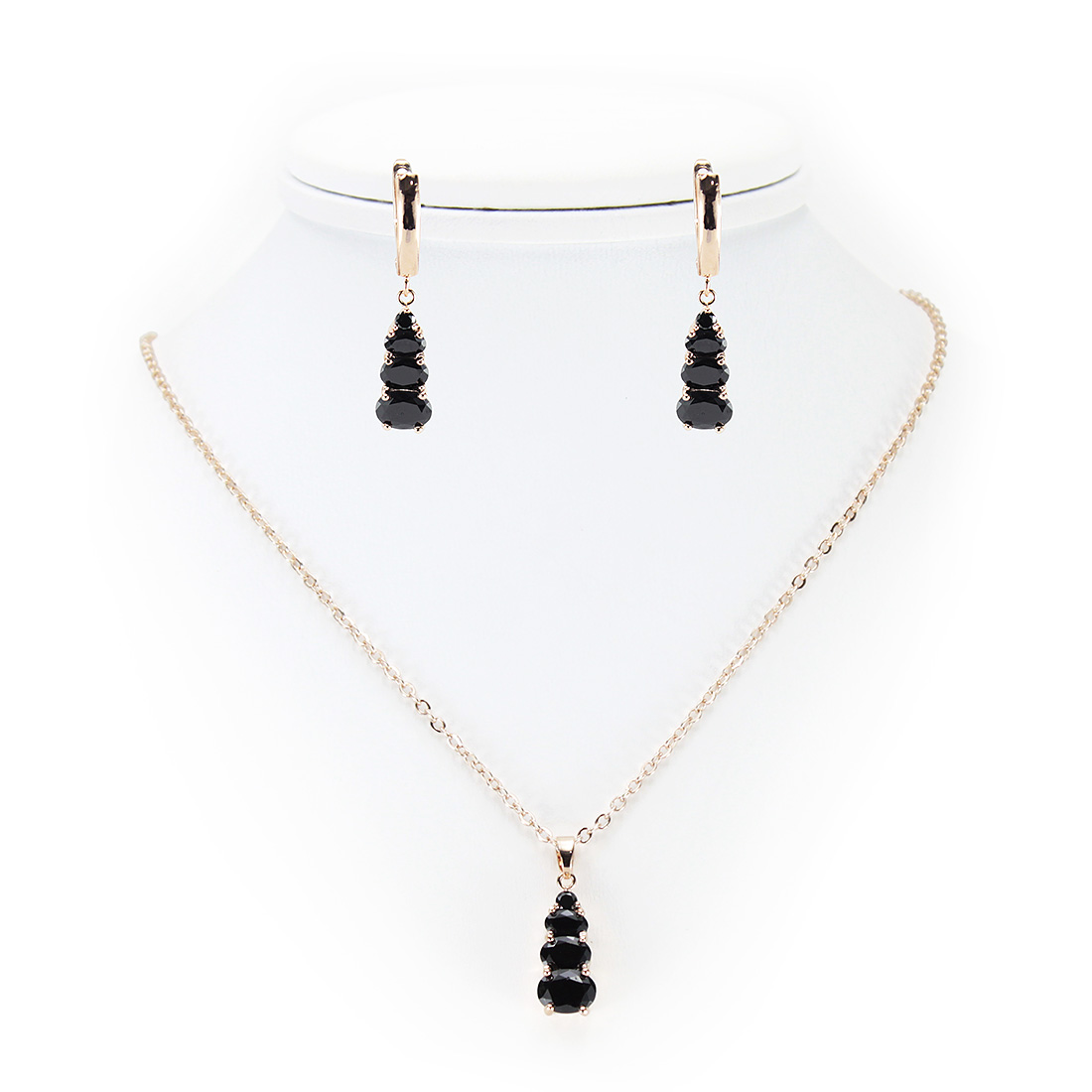Комплект с фианитами цвета "шпинель". Диаметр фианитов 3, 6, 7 и 8мм. Длина сережки с замочком 38мм. Длина кулона 25мм. Металл: ювелирный сплав под золото.