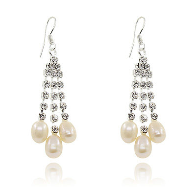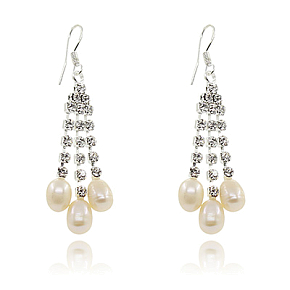 Легкие и воздушные серьги "Росинки" со стразами цвета "хрусталь" и натуральным речным жемчугом. Длина сережки с крючком 5см. Диаметр жемчуга примерно 6мм.
