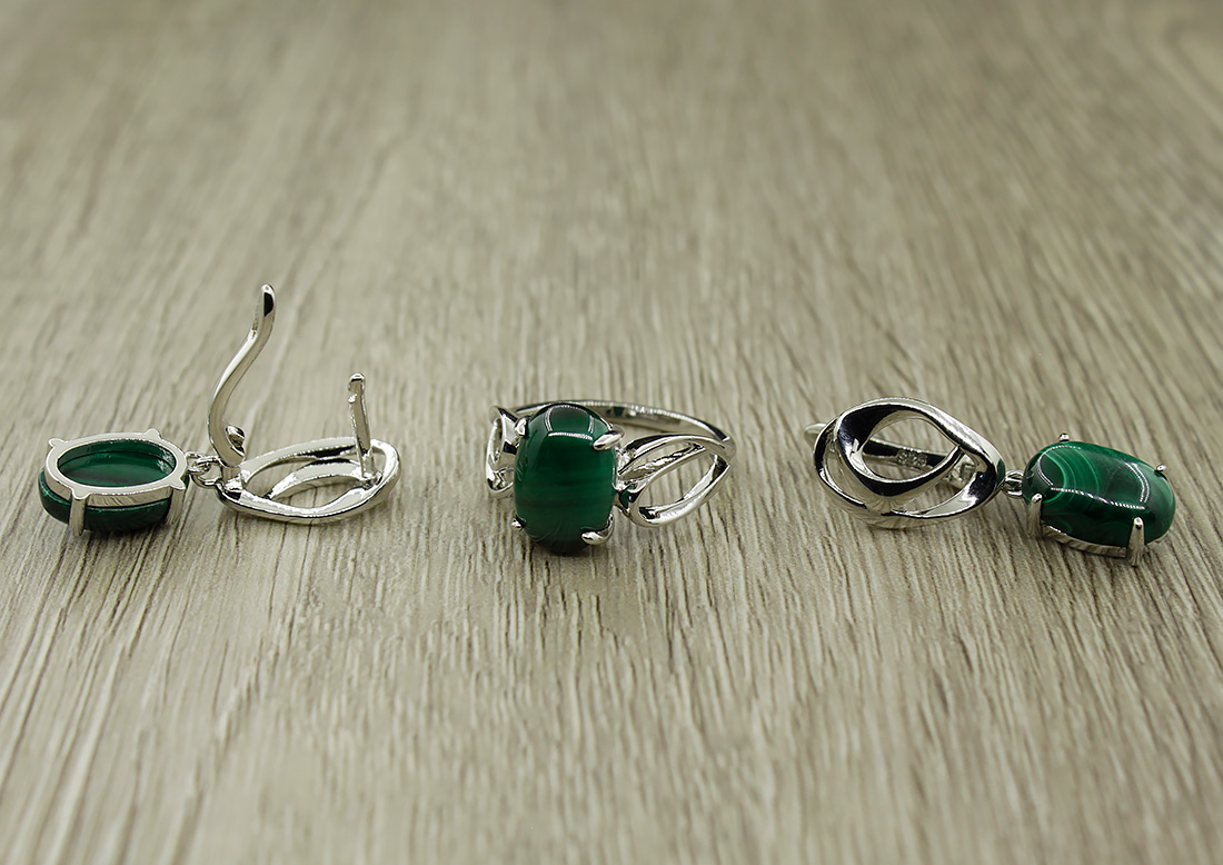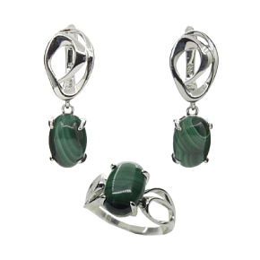 Стильный комплект с натуральным малахитом и качественным покрытием. Размер камня в серьге: 8x12мм, размер серьги с застежкой: 29мм. Размер камня в кольце: 8x12мм.