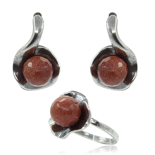 Комплект из коричневого граненого авантюрина в изящно изогнутой оправе. Размер кольца 20.