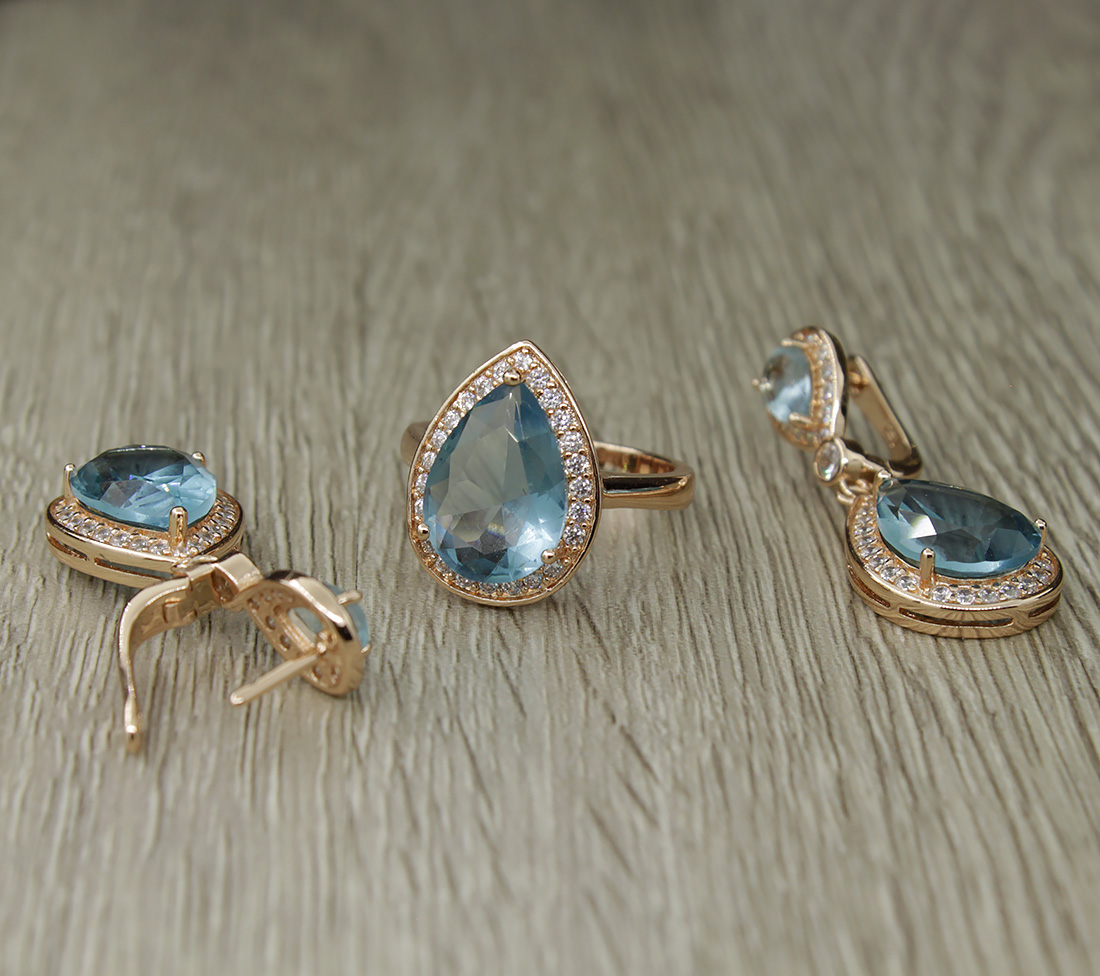 Изящный комплект с фианитом "голубой топаз" - нежный элемент Вашего повседневного или праздничного образа. Длина серьги с застежкой 35мм. Размер фианитов в серьгах 5x7мм и 10x13мм, в кольце 10x13мм. Размер кольца 18.