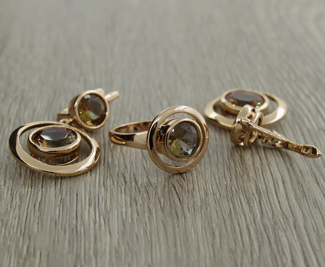 Модный комплект со вставкой из султанита и качественным покрытием. Диаметр камня в серьге и кольце 9мм. Длина серьги 40мм. Комплект находится на удаленном складе (отгрузка на 2 дня позже)