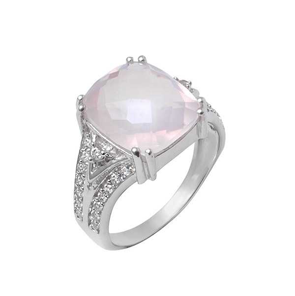 Кольцо из серебра 925 пробы с розовым кварцем природным и фианитом, покрытие: Родий. Средний вес изделия 4,34 гр.