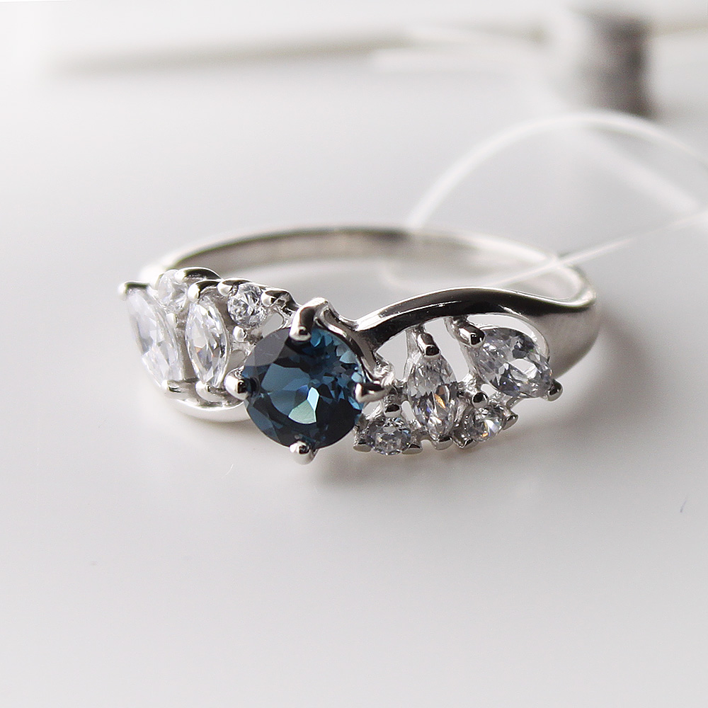 Кольцо из серебра 925 пробы с родиевым покрытием. Вставка из великолепного топаза Лондон в россыпи фианитов. Диаметр камня: 5мм. Размер кольца: 17