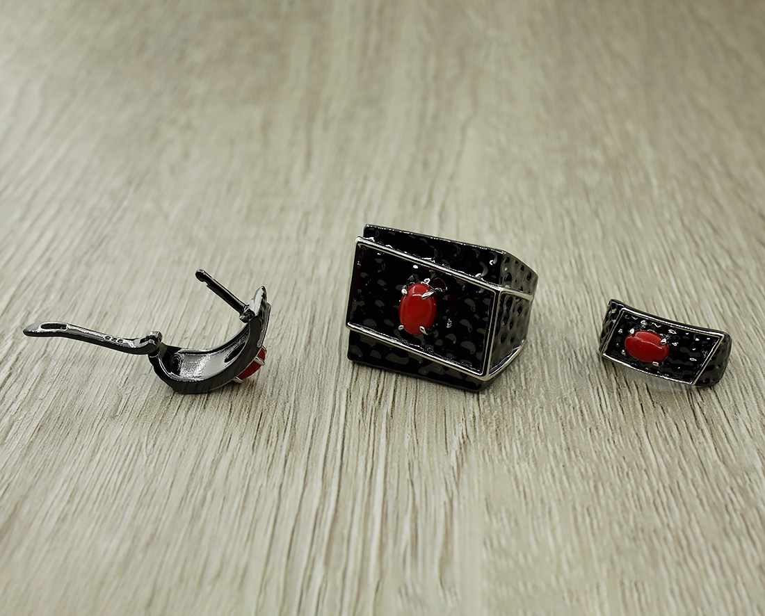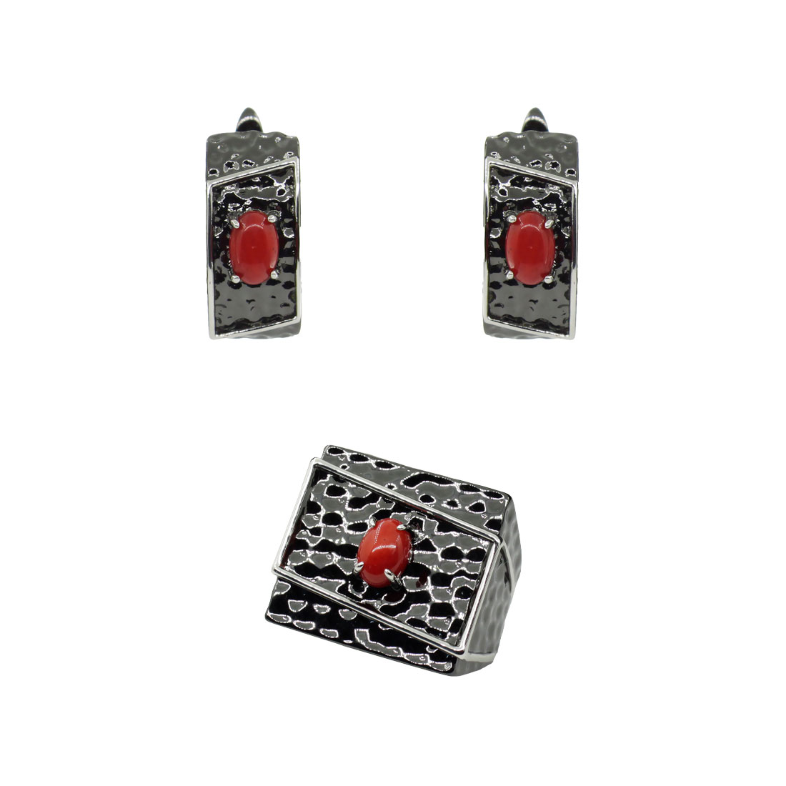 Яркий комплект с натуральным кораллом и качественным покрытием. Размер камня в серьге: 4x6мм, размер серьги с застежкой: 18мм. Размер камня в кольце: 5x7мм.