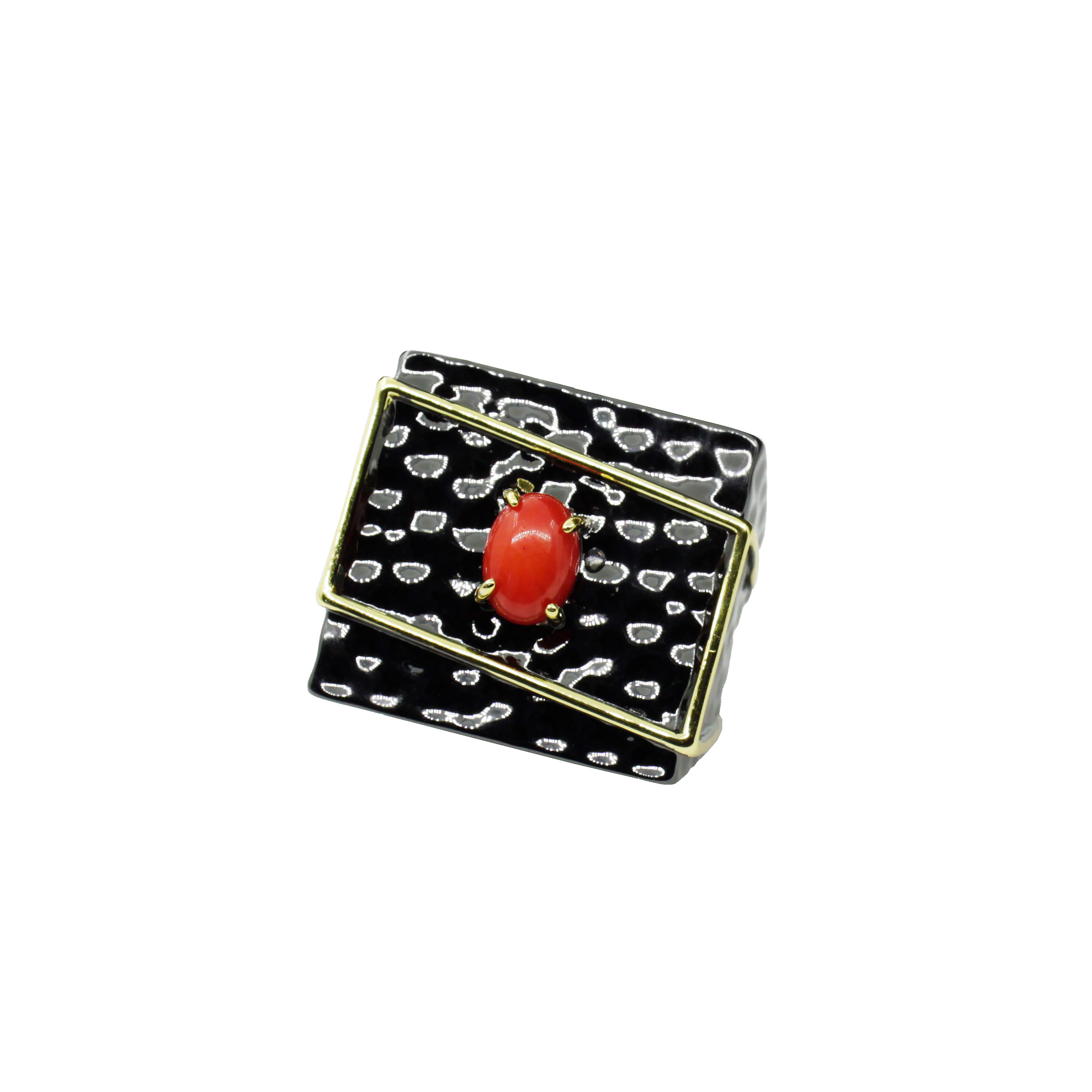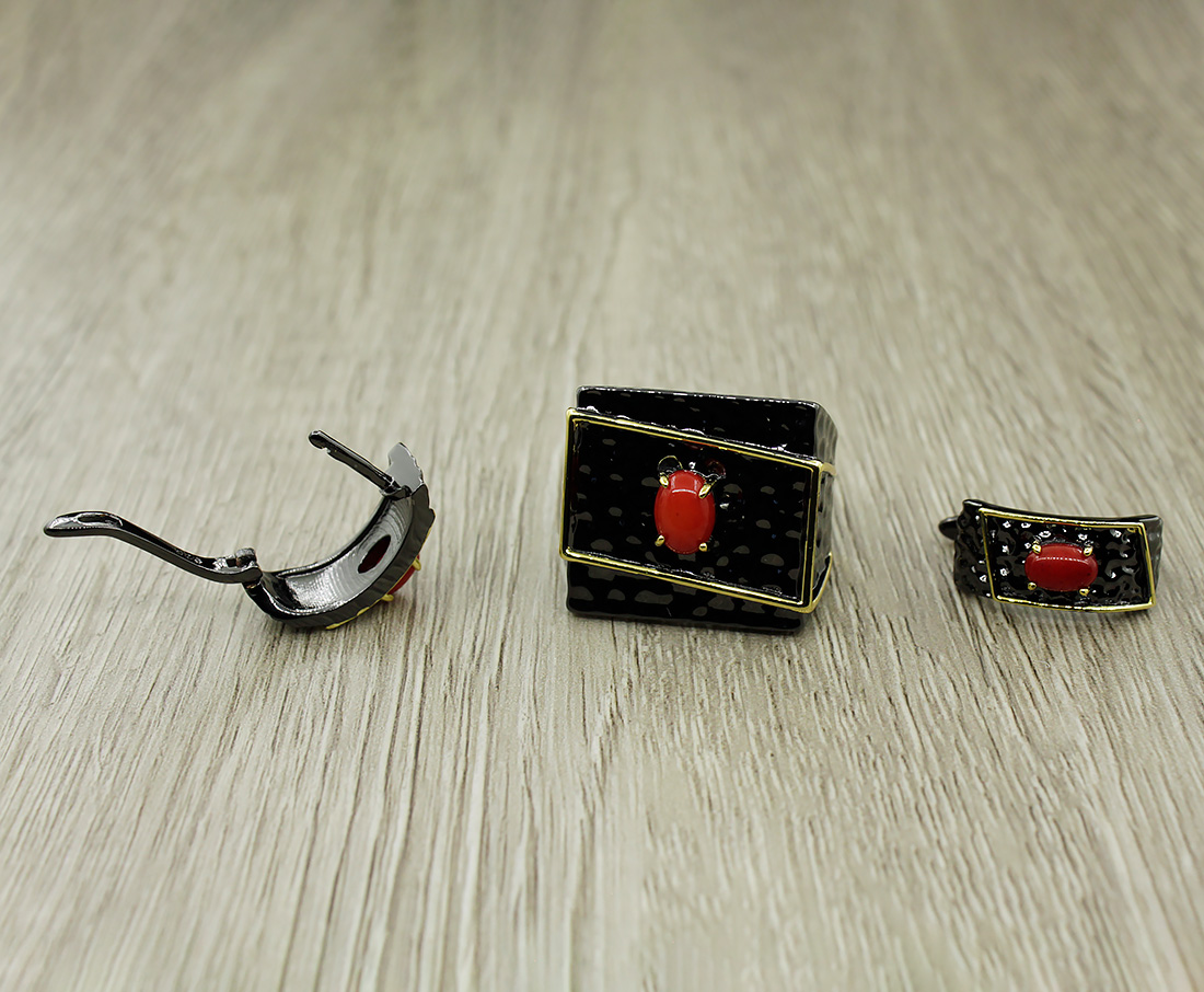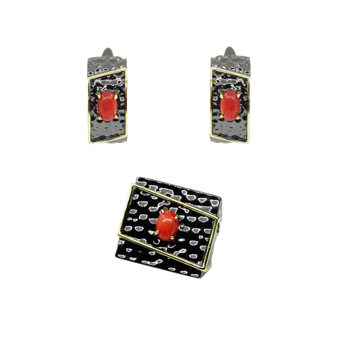 Яркий комплект с натуральным кораллом и качественным покрытием. Размер камня в серьге: 4x6мм, размер серьги с застежкой: 18мм. Размер камня в кольце: 5x7мм.