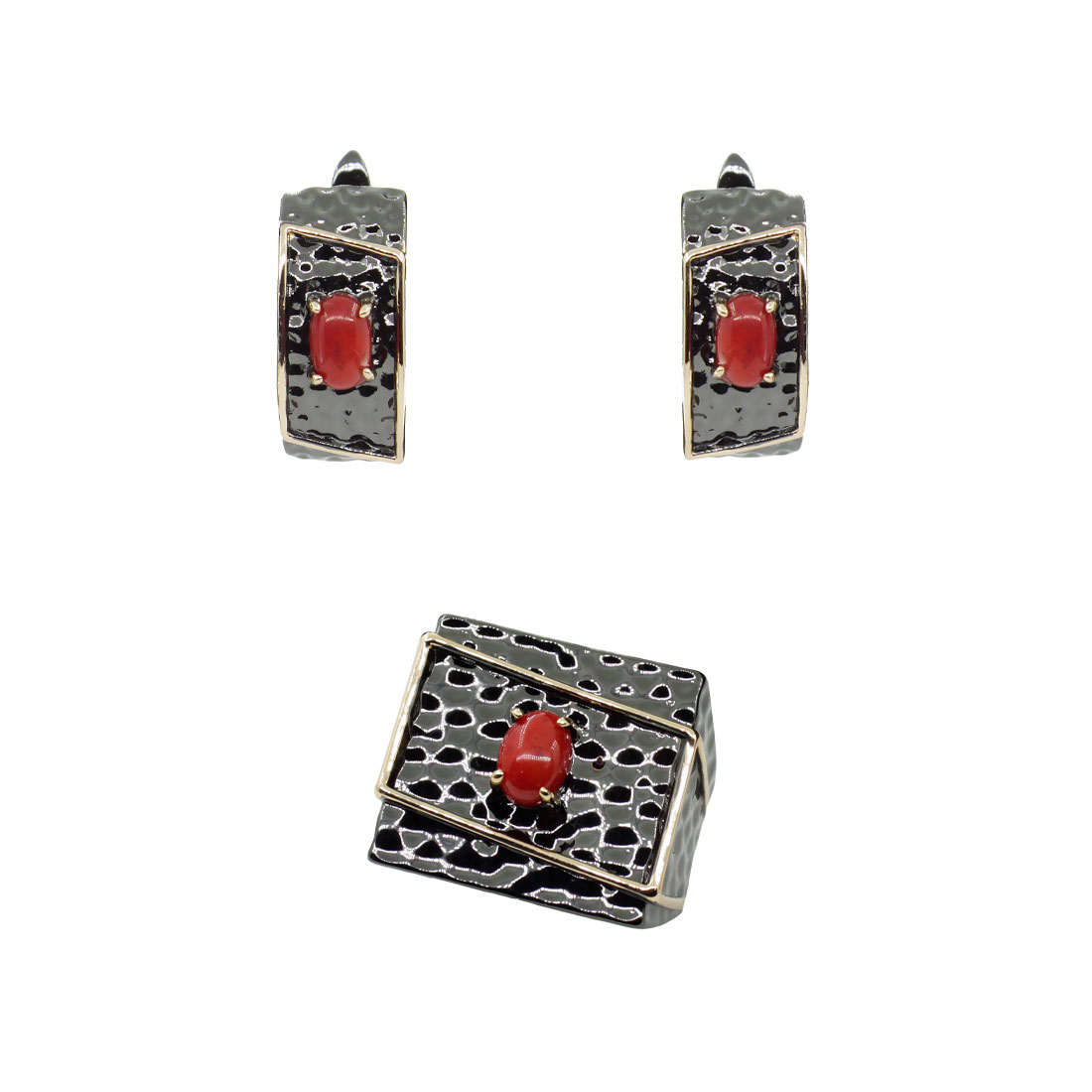 Яркий комплект с натуральным кораллом и качественным покрытием. Размер камня в серьге: 4x6мм, размер серьги с застежкой: 18мм. Размер камня в кольце: 5x7мм.