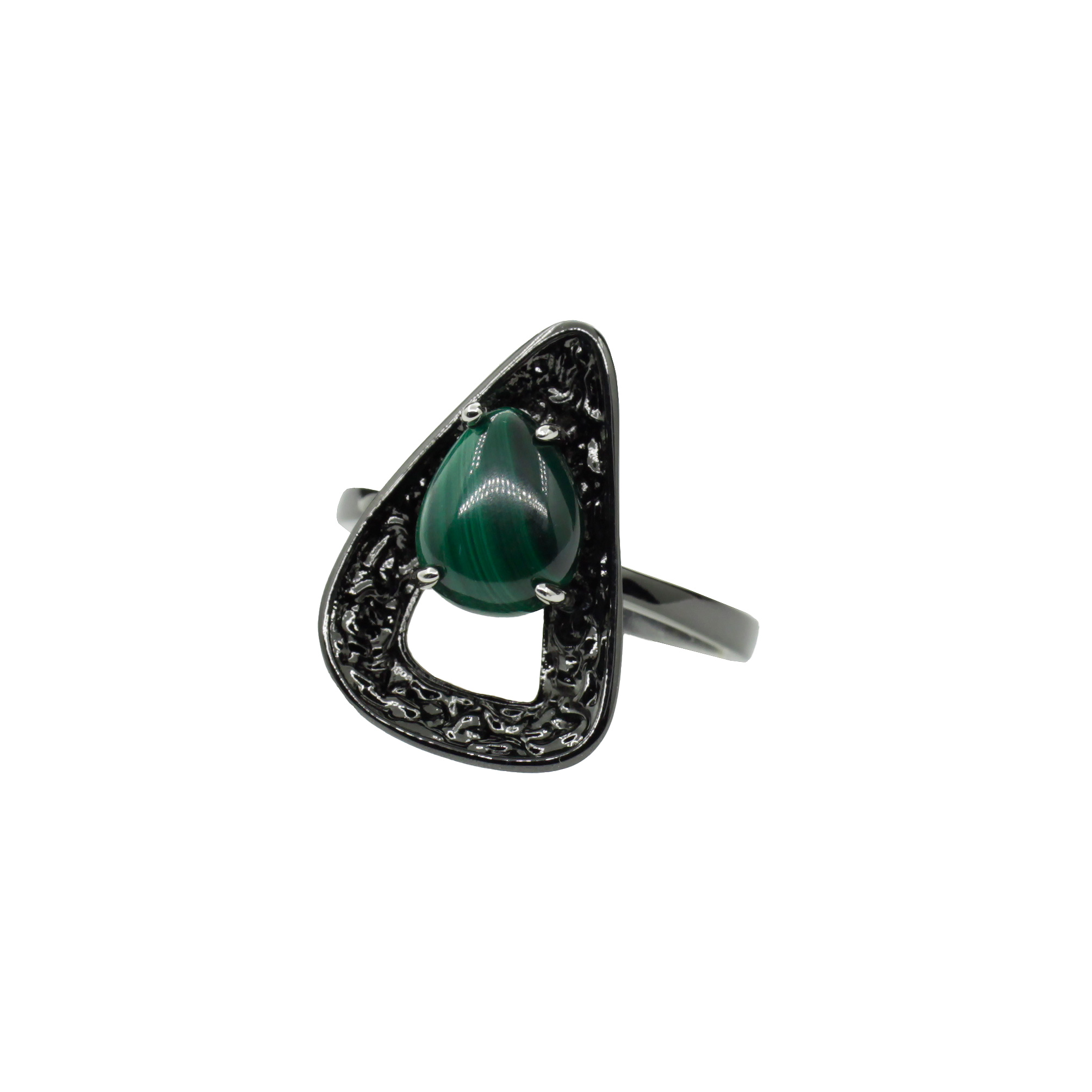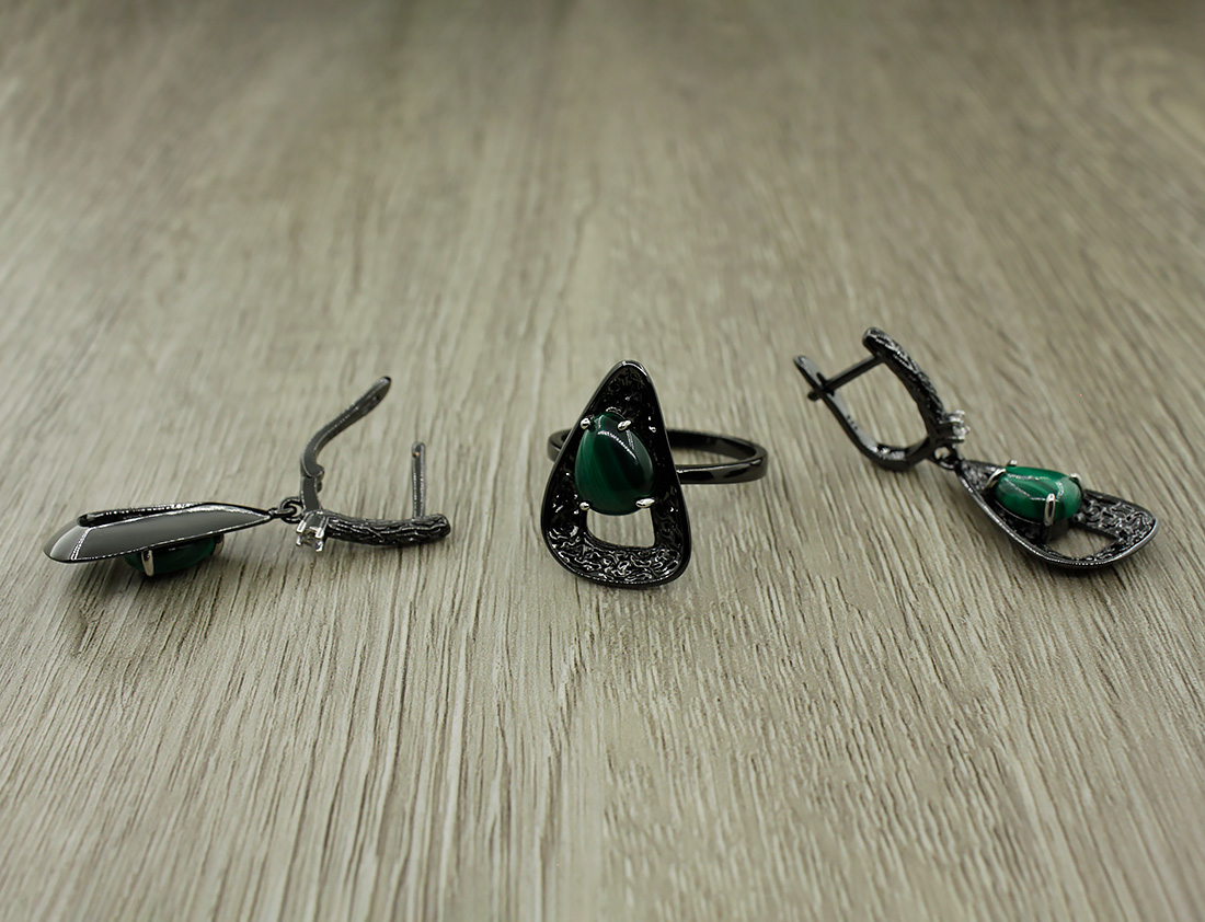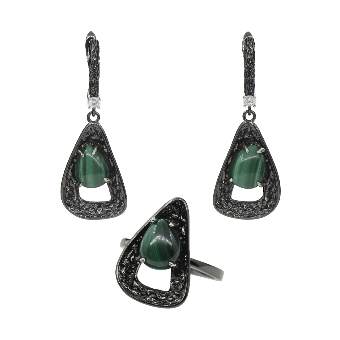 Стильный комплект с натуральным малахитом и качественным покрытием. Размер камня в серьге: 8x10мм, размер серьги с застежкой: 40мм. Размер камня в кольце: 8x10мм.