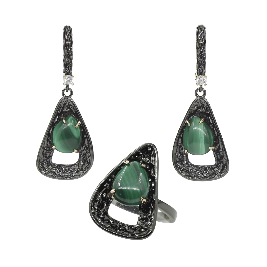 Стильный комплект с натуральным малахитом и качественным покрытием. Размер камня в серьге: 8x10мм, размер серьги с застежкой: 40мм. Размер камня в кольце: 8x10мм.