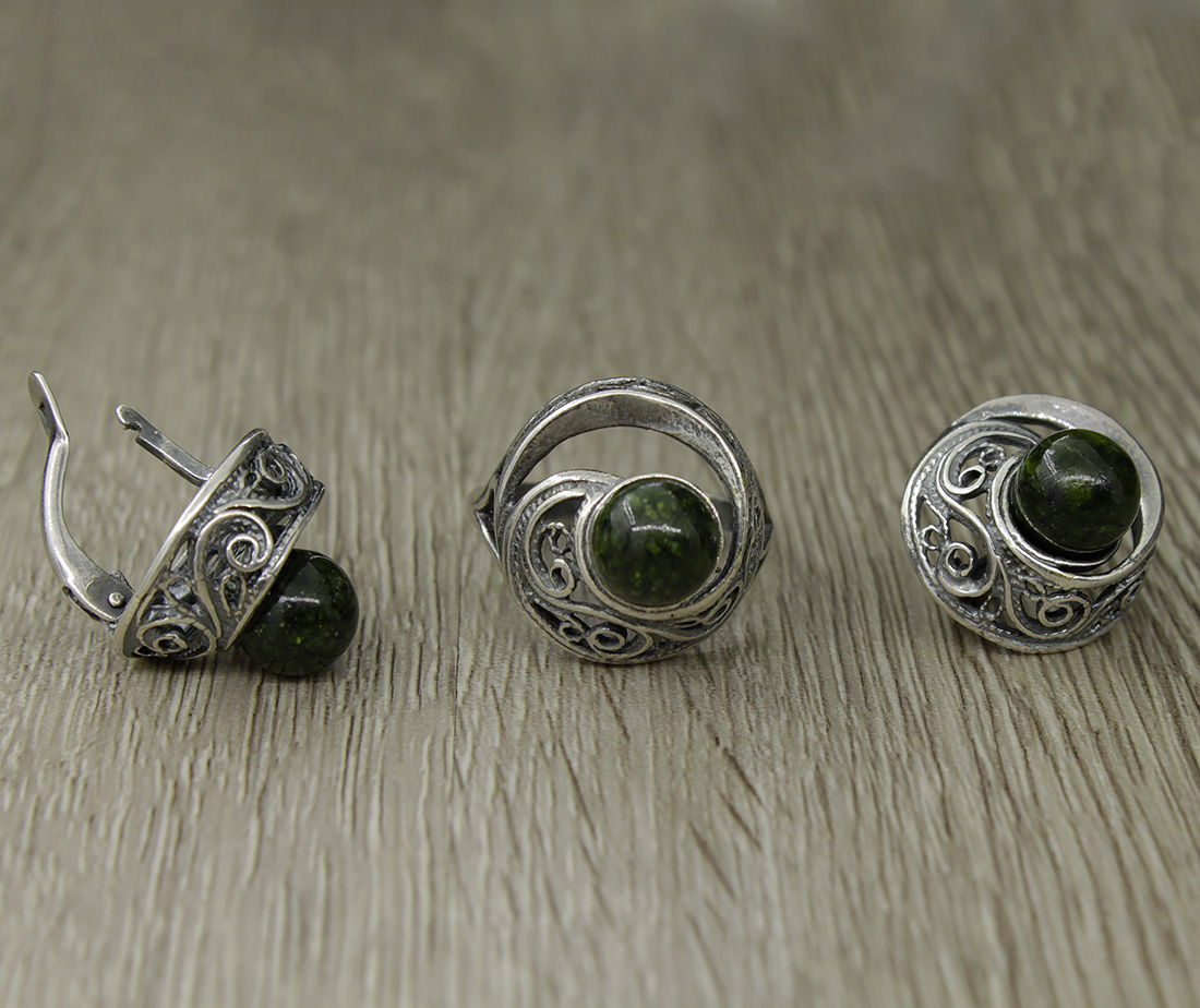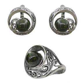 Коплект из кольца и серег с натуральным змеевиком выглядит поистине сказочно -- камень оплетен витиеватыми узорами. Диаметр камня в кольце 8мм, в серьгах 8мм, размер кольца 18,5.