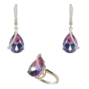 Нежный и женственный комплект с фианитом "турмалин" фиолетово- голубого цвета. Размер камня в серьге: 11х17мм, размер серьги с застежкой: 39мм. Размер камня в кольце: 11х15мм.