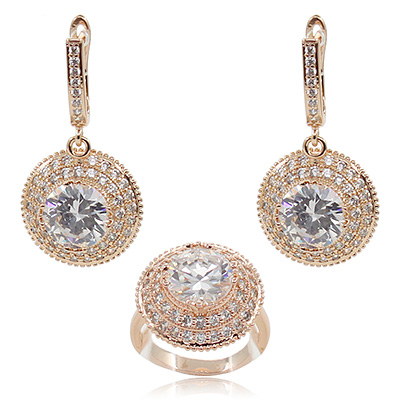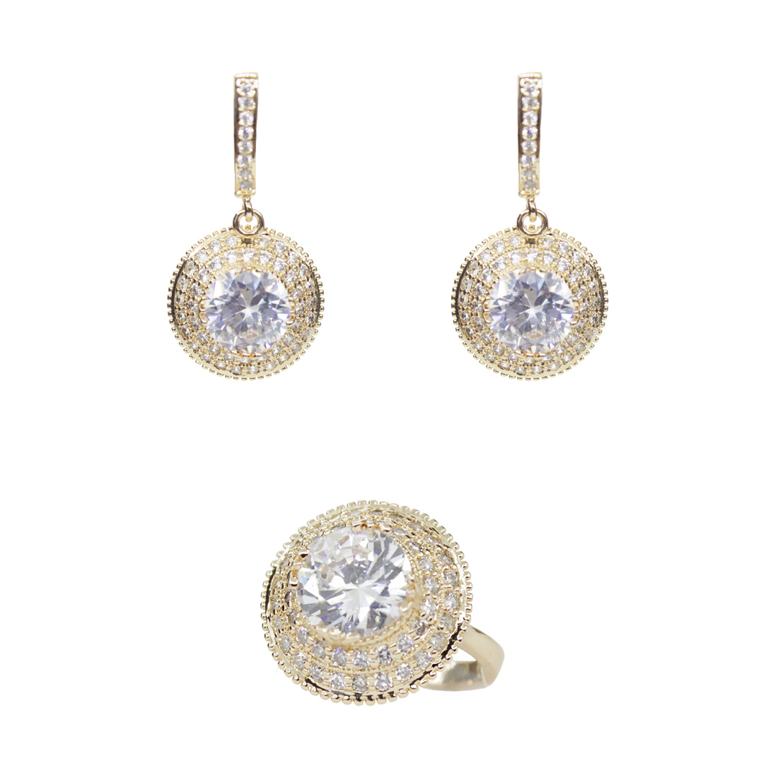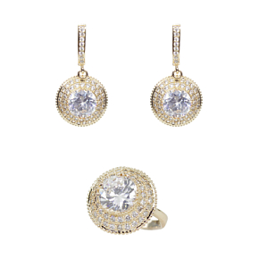Сияющий, энергетичный, поблескивающий, манящий комплект со вставкими фианита "хрусталь". Комплект выполнен из ювелирного сплава под "золото". Размер кольца 18. Длинна сережки 3,5см, ширина 1,9см.