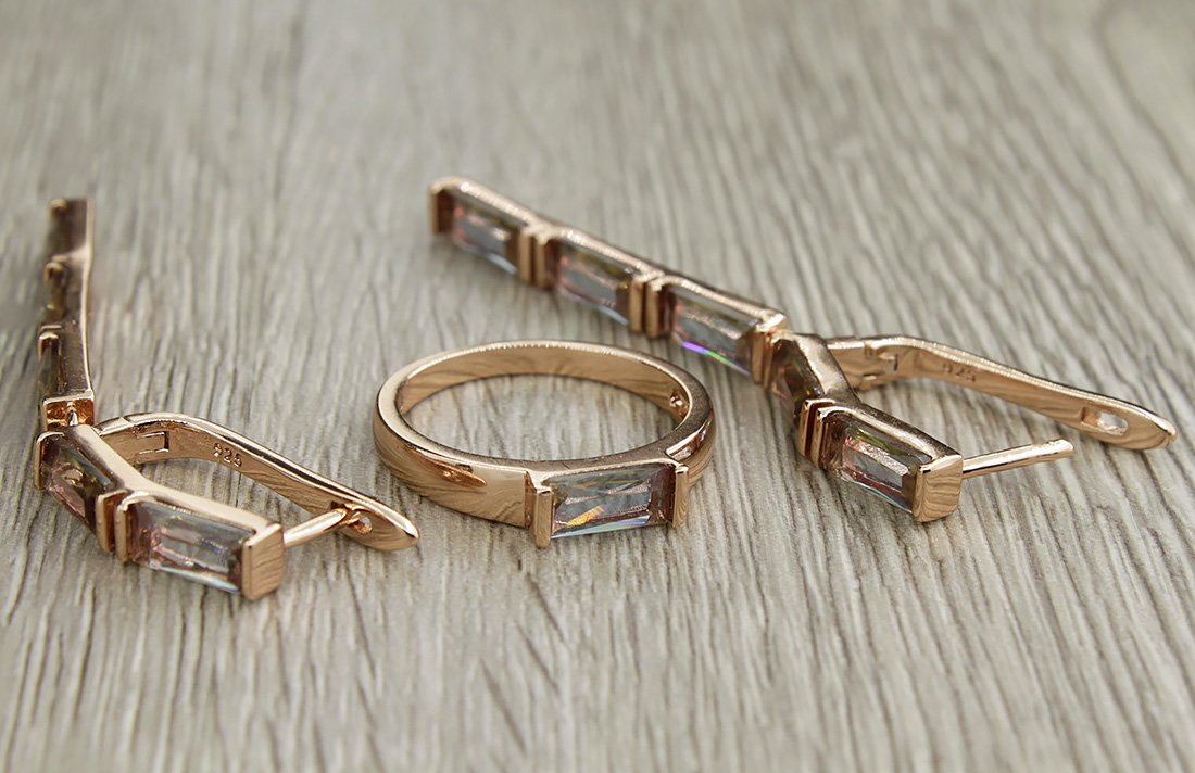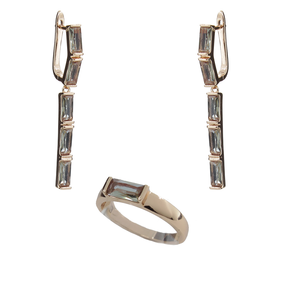 Стильный комплект со вставками из султанита и качественным покрытием. Длина серьги с застёжкой: 50мм. Размер камней: 4х8мм.