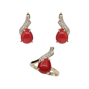 Яркий комплект с натуральным кораллом и качественным покрытием. Размер камня в серьге: 8x10мм, размер серьги с застежкой: 18мм. Размер камня в кольце: 8x10мм.