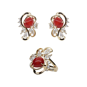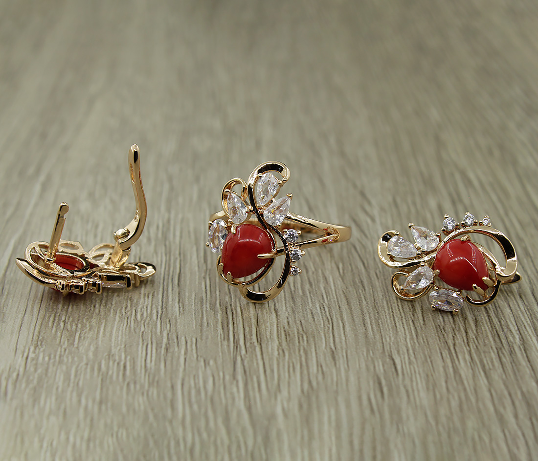 Яркий комплект с натуральным кораллом и качественным покрытием. Размер камня в серьге: 7x9мм, размер серьги с застежкой: 21мм. Размер камня в кольце: 7x9мм.