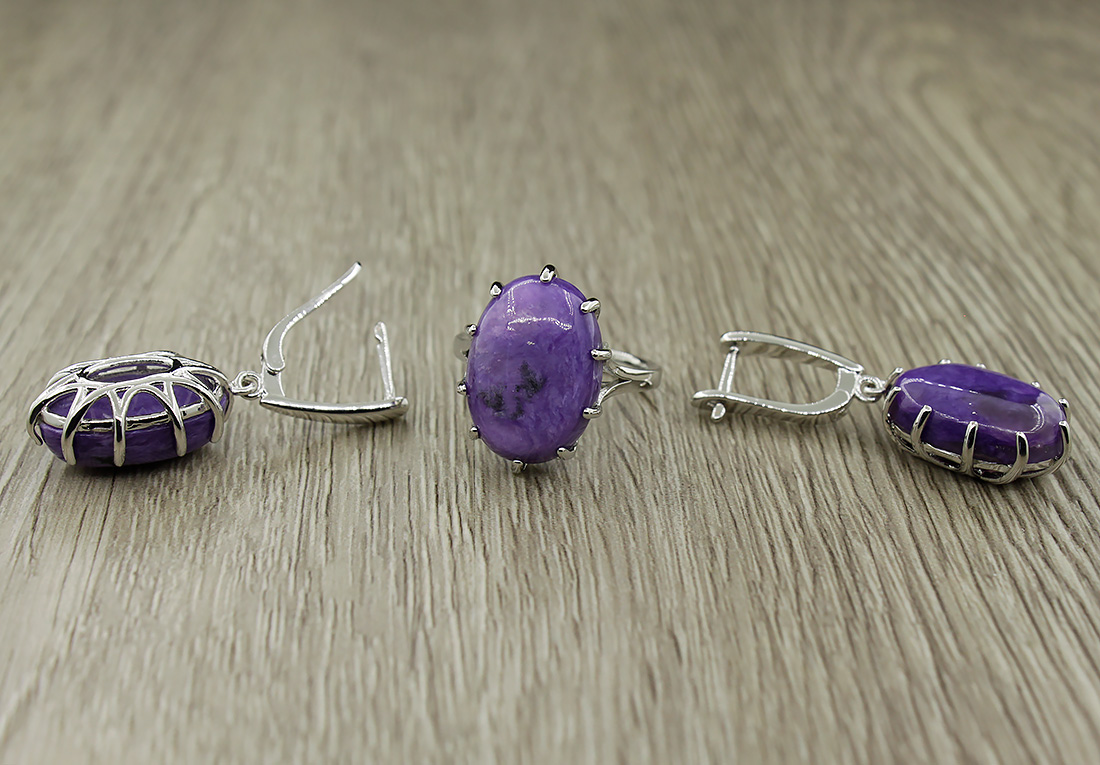 Манящий комплект с натуральным чароитом и качественным покрытием. Размер камня в серьге: 13x18мм, размер серьги с застежкой: 38мм. Размер камня в кольце: 13x17мм.