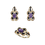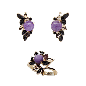 Комплект с загадочным и манящим чароитом и качественным покрытием. Диаметр камня в серьге: 8мм, размер серьги с застежкой: 12мм. Диаметр камня в кольце: 6мм.