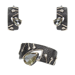 Стильный комплект с султанитом и качественным покрытием. Размер камня в серьге: 5x8мм, размер серьги с застежкой: 18.5мм. Размер камня в кольце: 7x10мм.Ширина кольца 10мм