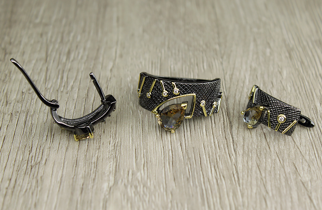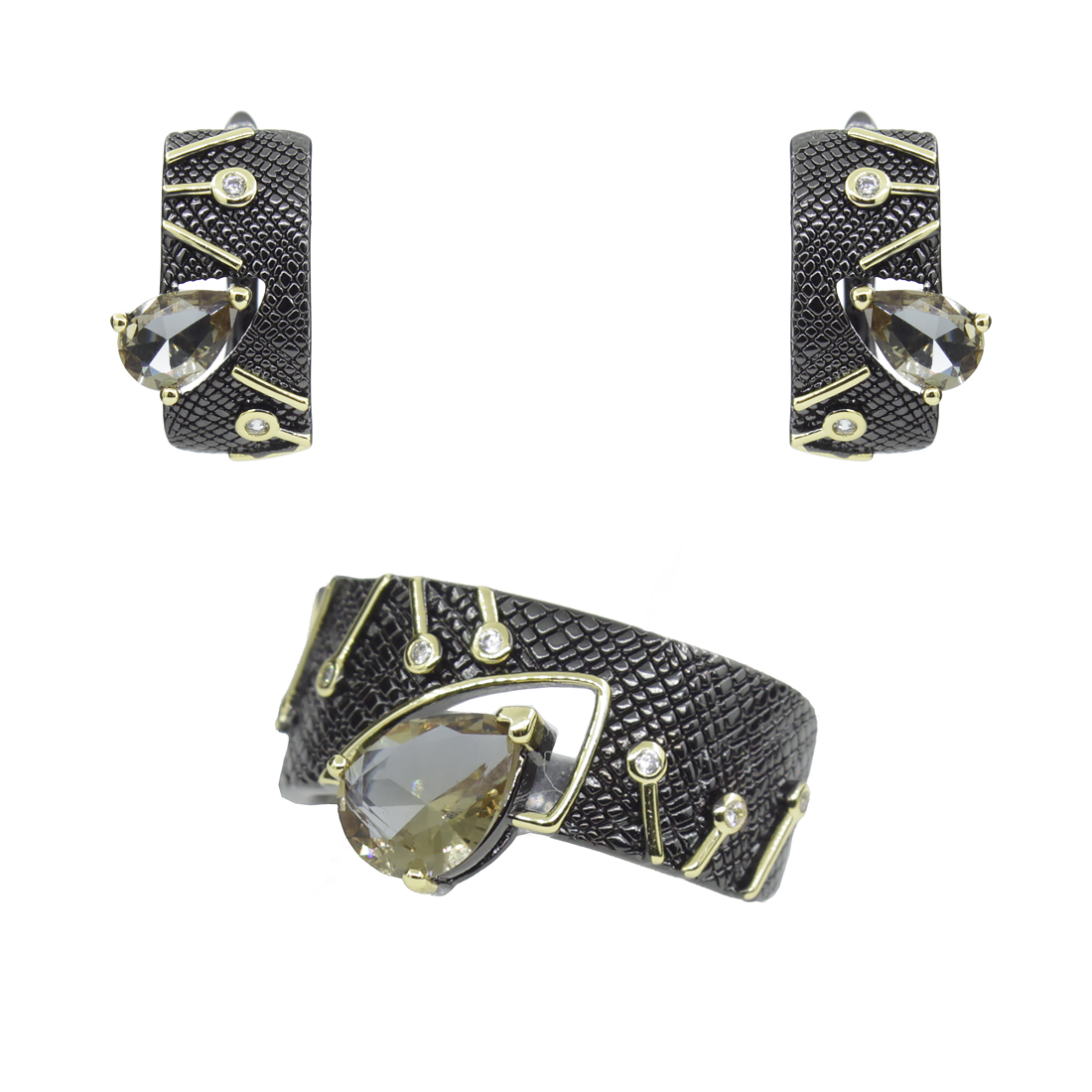 Стильный комплект с султанитом и качественным покрытием. Размер камня в серьге: 5x8мм, размер серьги с застежкой: 18.5мм. Размер камня в кольце: 7x10мм.Ширина кольца 10мм