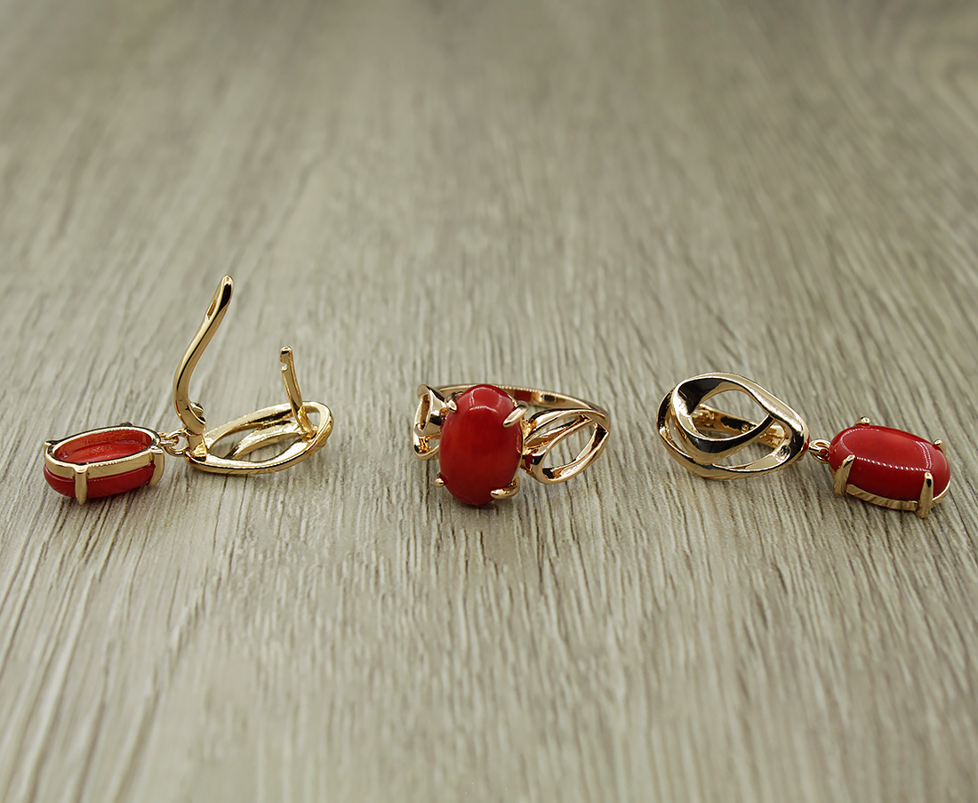 Яркий комплект с натуральным кораллом и качественным покрытием. Размер камня в серьге: 8x12мм, размер серьги с застежкой: 29мм. Размер камня в кольце: 8x12мм.