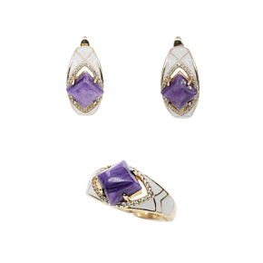 Комплект с загадочным и манящим чароитом и качественным покрытием. Размер камня в серьге: 8x8мм, размер серьги с застежкой: 23мм. Размер камня в кольце: 8x8мм.