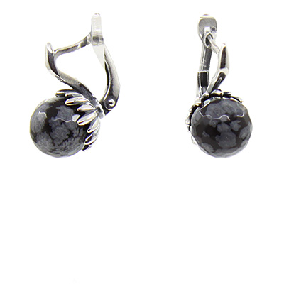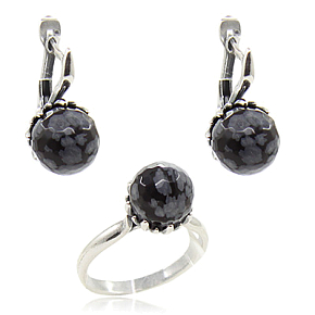 Комплект украшен натуральным камнем - снежным обсидианом. Диаметр вставки 10мм. Размер кольца - 18.