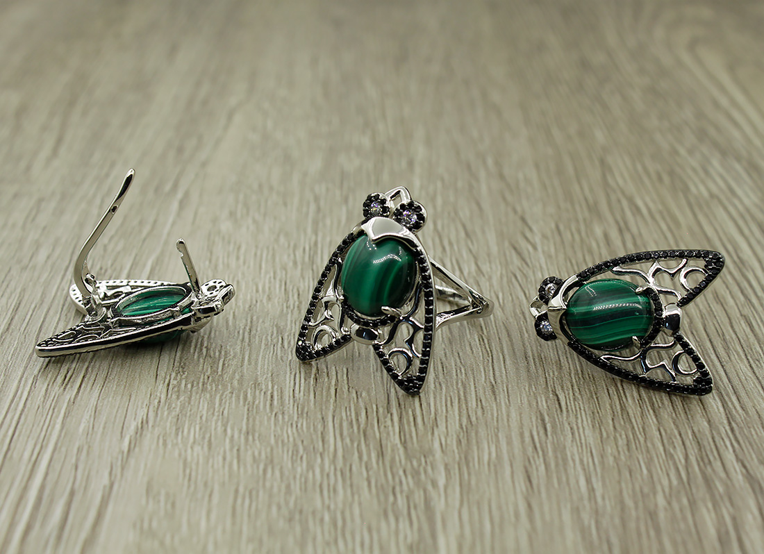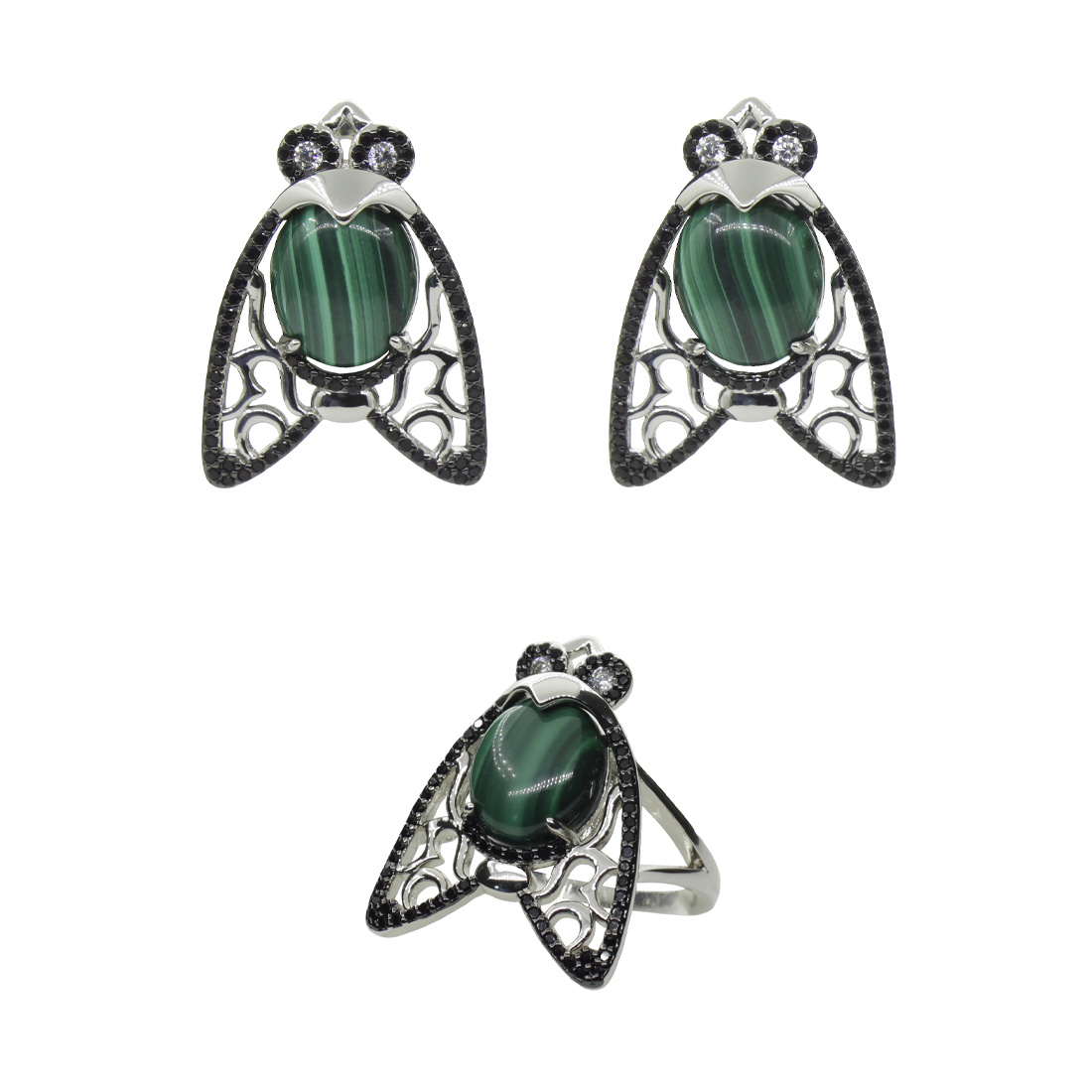Стильный комплект с натуральным малахитом и качественным покрытием. Размер камня в серьге: 9x10мм, размер серьги с застежкой: 26мм. Размер камня в кольце: 9x10мм.