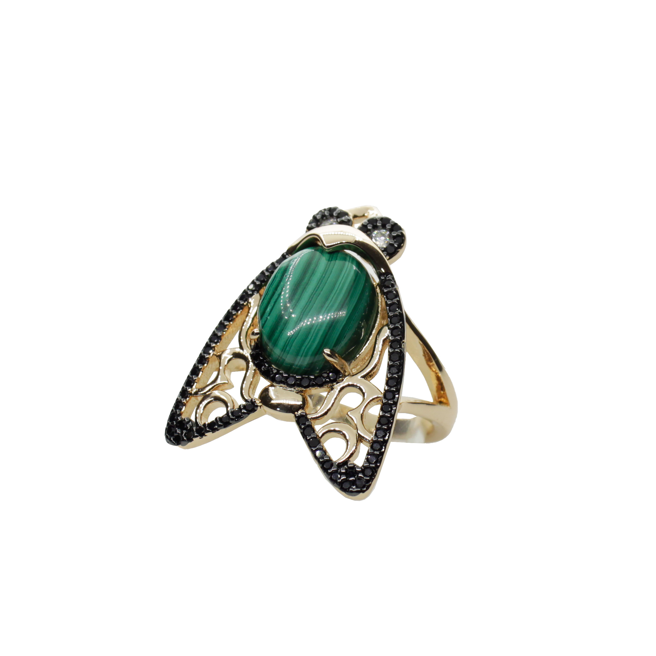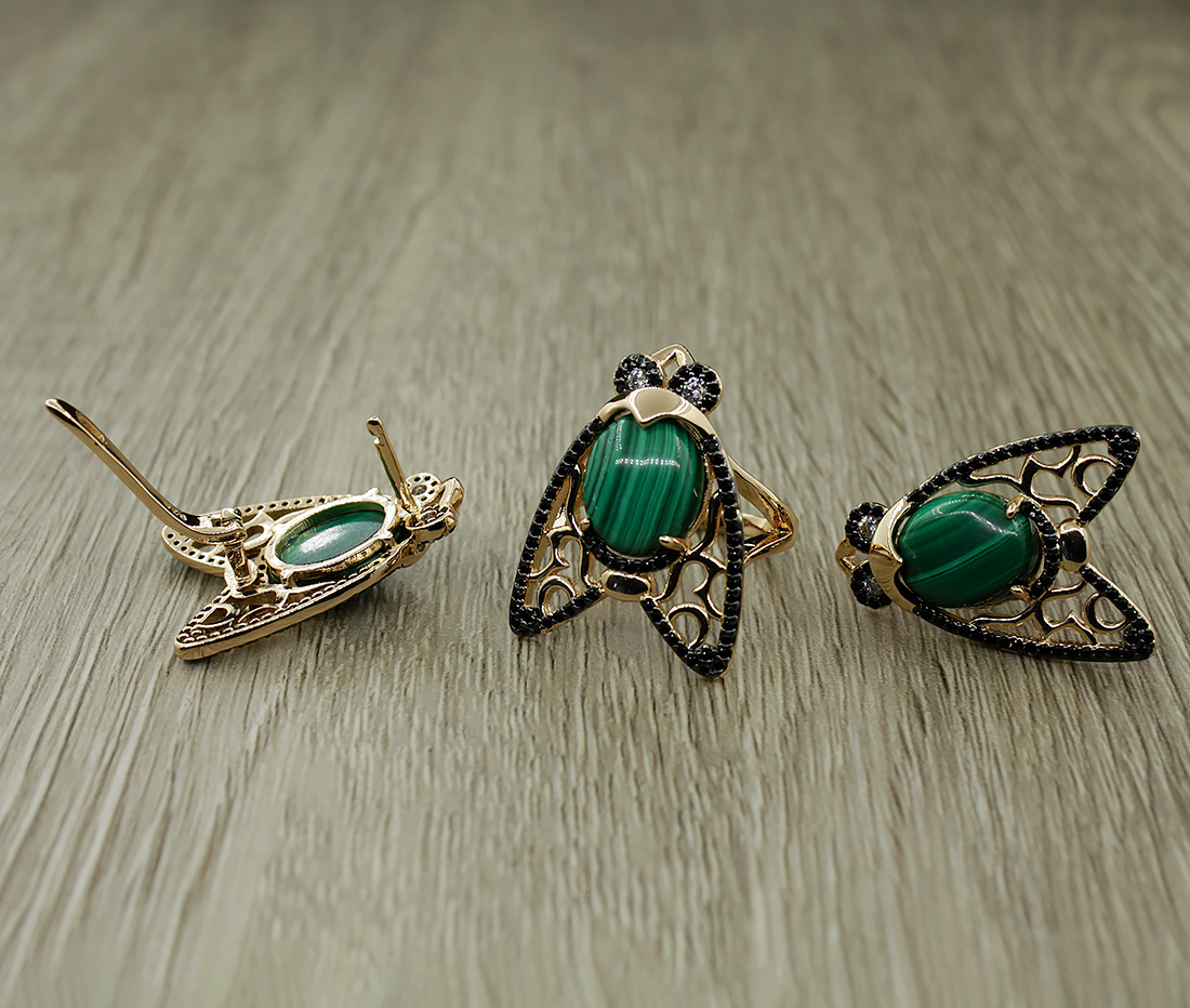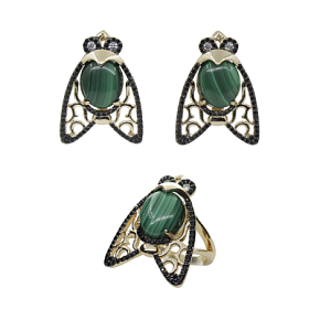 Стильный комплект с натуральным малахитом и качественным покрытием. Размер камня в серьге: 9x10мм, размер серьги с застежкой: 26мм. Размер камня в кольце: 9x10мм.