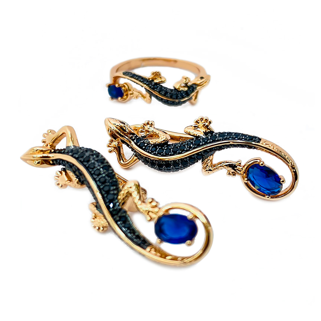 Комплект "Ящерки", фианит цвета "сапфир", покрытие под золото, размеры кольца:17, 18, 19, 20