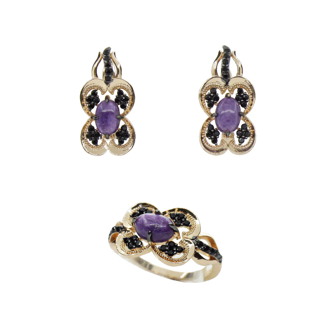 Манящий комплект с натуральным чароитом и качественным покрытием. Размер камня в серьге: 5x7мм, размер серьги с застежкой: 21мм. Размер камня в кольце: 5x7мм.