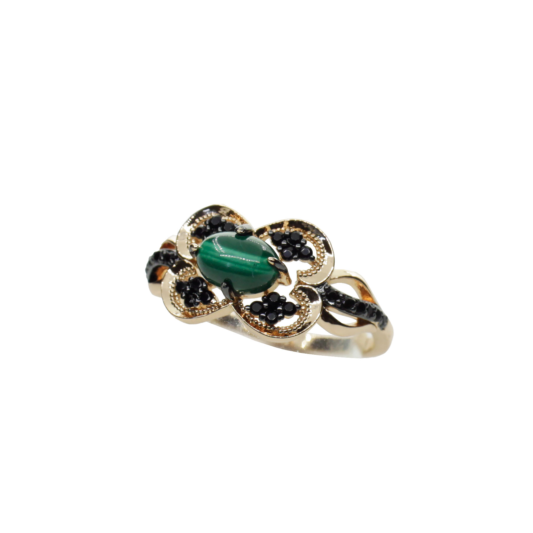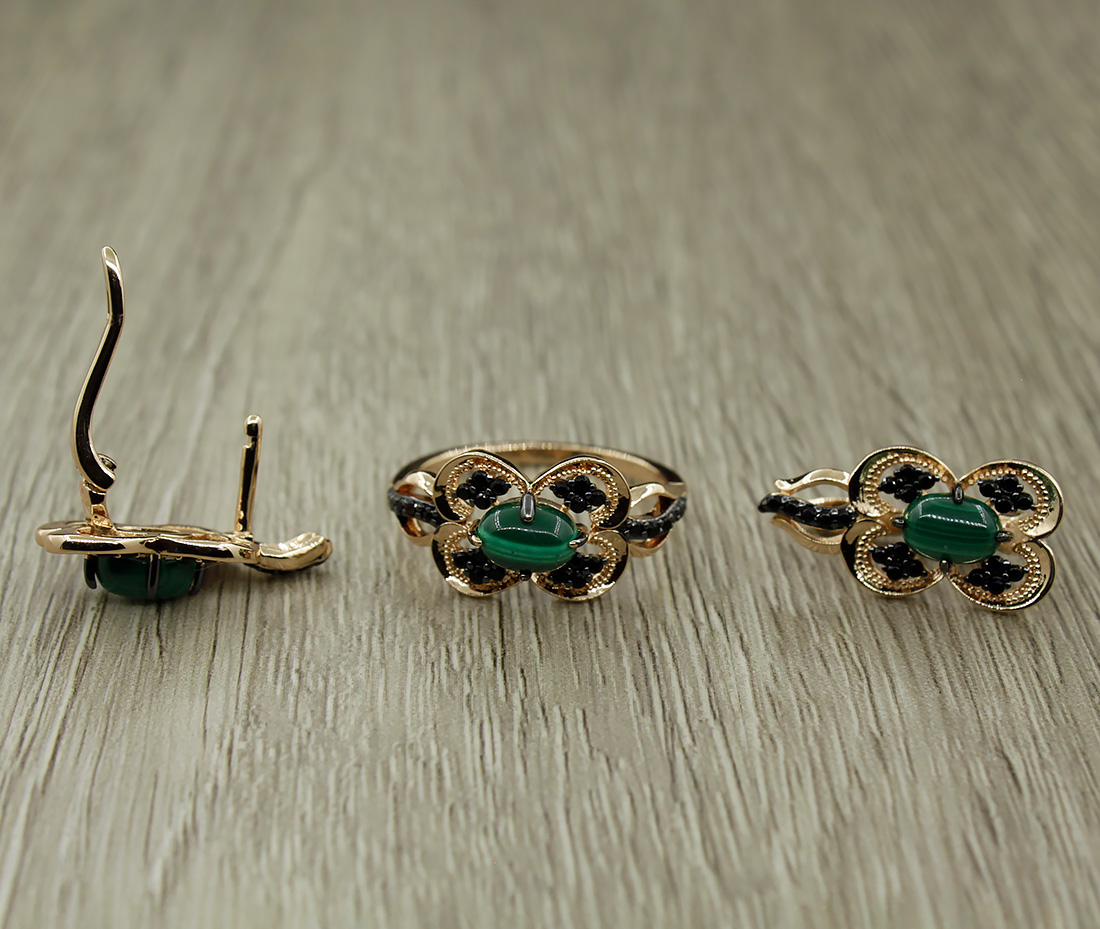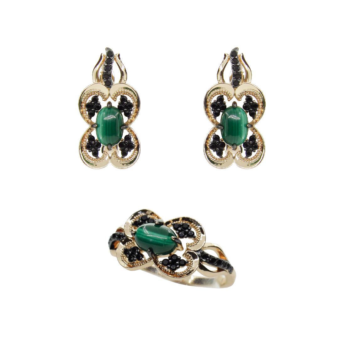 Стильный комплект с натуральным малахитом и качественным покрытием. Размер камня в серьге: 5x7мм, размер серьги с застежкой: 21мм. Размер камня в кольце: 5x7мм.