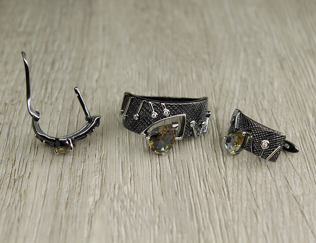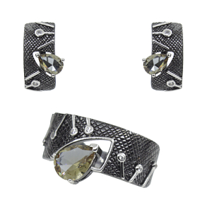 Стильный комплект с султанитом и качественным покрытием. Размер камня в серьге: 5x8мм, размер серьги с застежкой: 18.5мм. Размер камня в кольце: 7x10мм.Ширина кольца 10мм