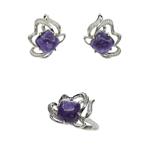 Манящий комплект с натуральным чароитом и качественным покрытием. Размер камня в серьге: 10x10мм, размер серьги с застежкой: 21мм. Размер камня в кольце: 10x10мм.