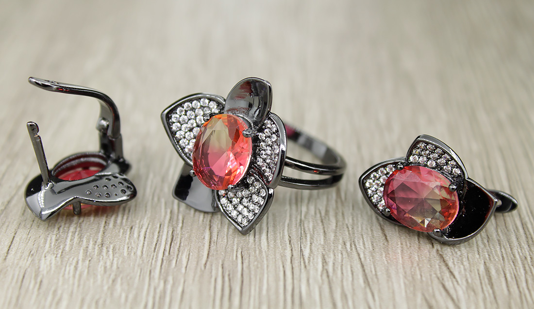 Нежный комплект в виде цветка с фианитом "турмалин" красно-желтого цвета. Размер камня в серьге: 8х11мм, размер серьги с застежкой: 18мм. Размер камня в кольце: 8х10мм. Размера кольца 19х20мм