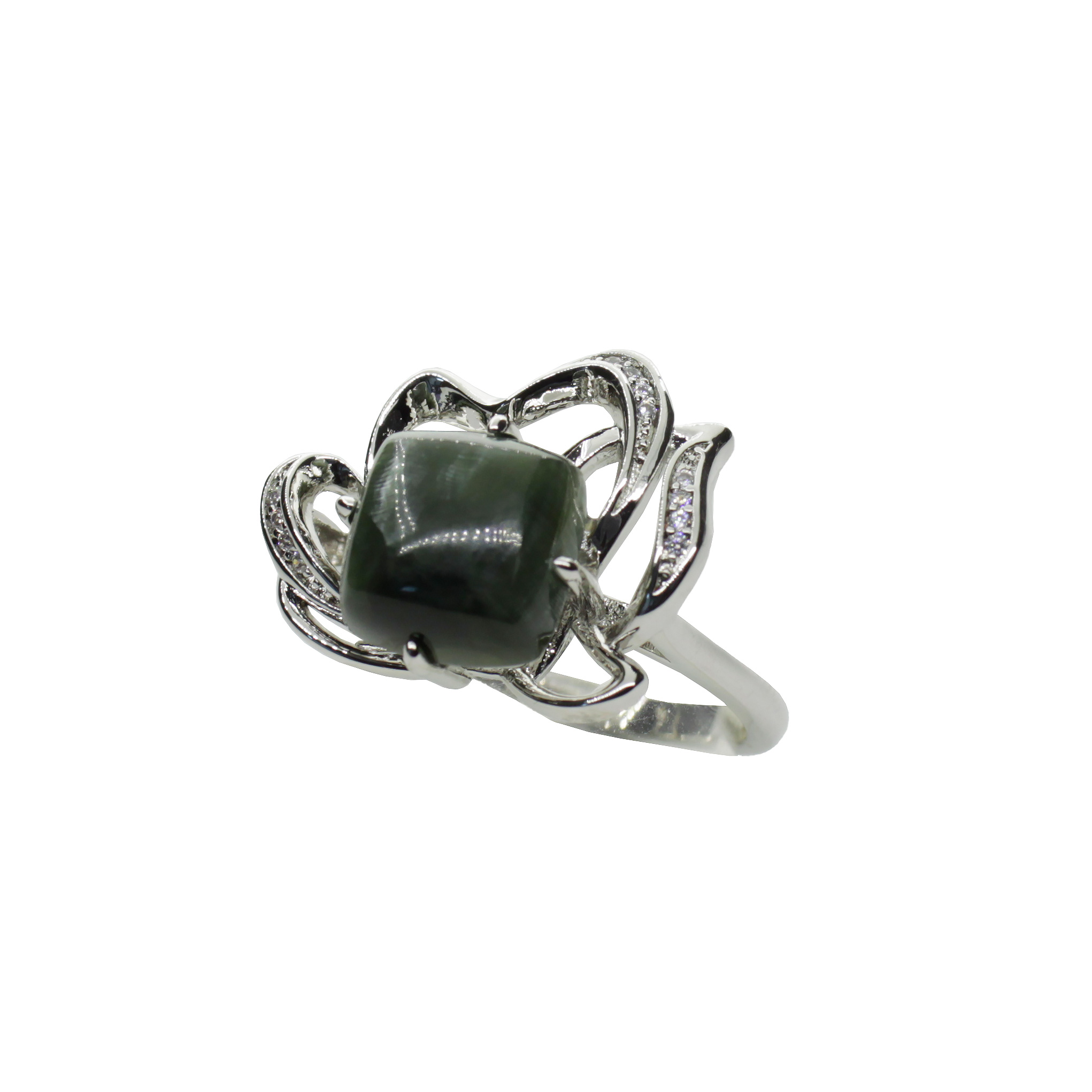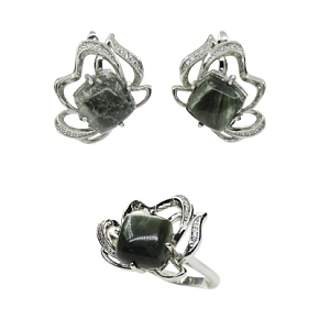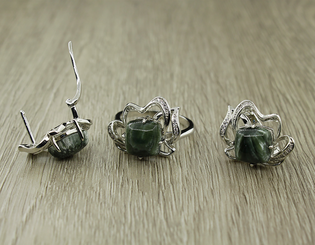 Элегантный комплект с натуральным серафинитом и качественным покрытием. Размер камня в серьге: 10x10мм, размер серьги с застежкой: 21мм. Размер камня в кольце: 10x10мм.