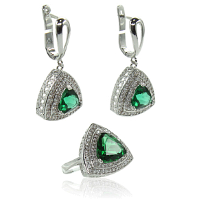 Данный комплект инкрустирован 189 маленькими фианитами и 3 большими. Размер кольца 19. Размер большого камня 10мм.