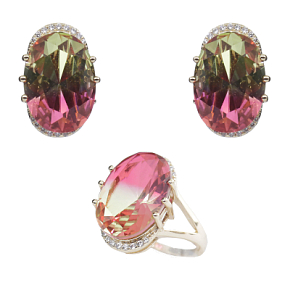 Удивительный комплект с крупным фианитом "турмалин" красно-желтого цвета. Размер камня в серьге: 13х18мм, размер серьги с застежкой: 20,5мм. Размер камня в кольце: 13х18мм.
