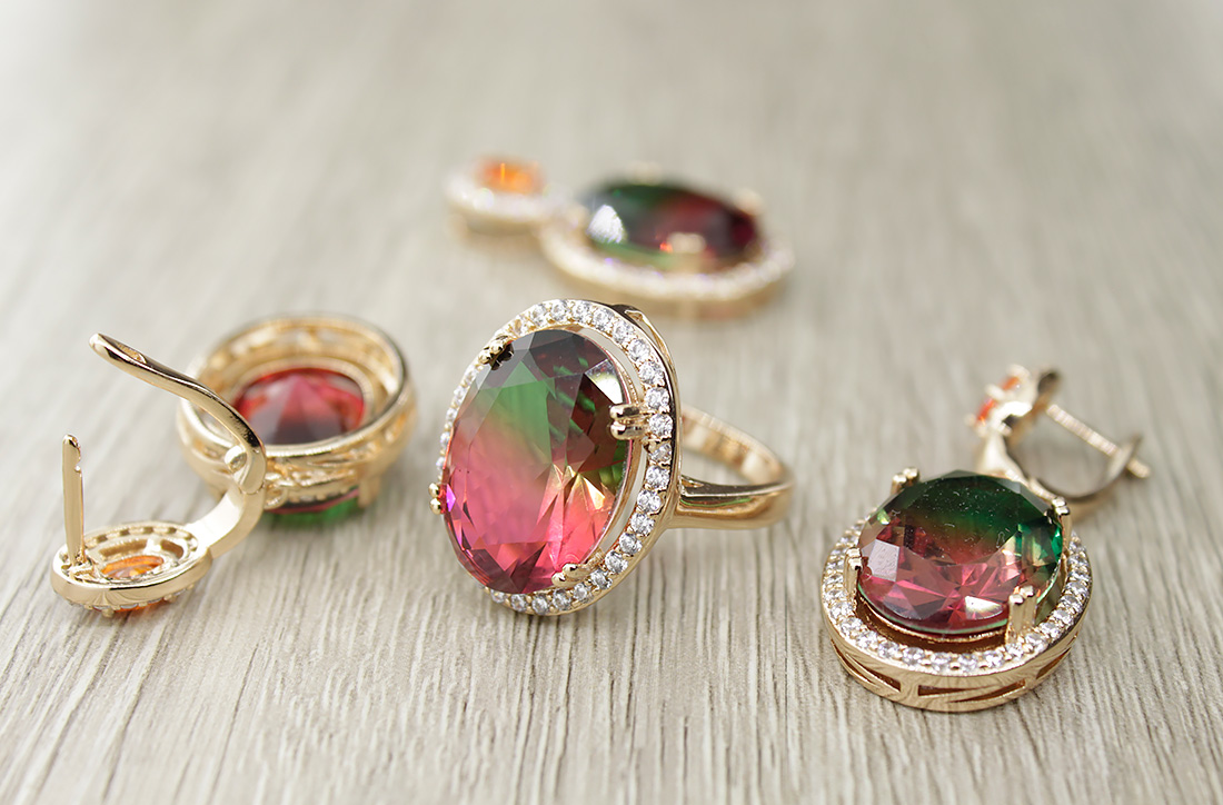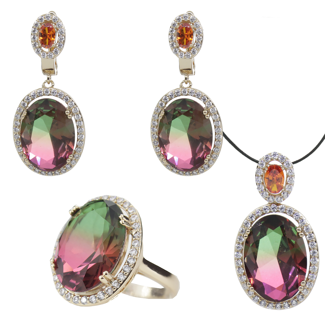Полный комплект с крупным фианитом "турмалин" красно-зеленого цвета, состоящий из кольца, сережек и подвески. Размер камня в серьге: 13х18мм, размер серьги с застежкой: 40мм. Размер камня в кольце: 13х18мм. Размер камня в подвеске 13х18, размер подвески целиком 33мм