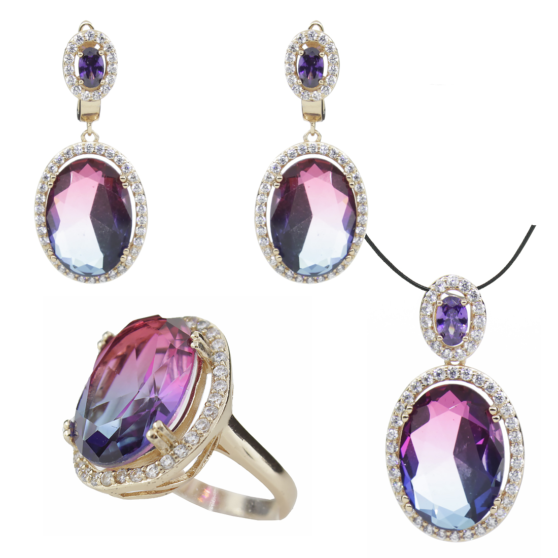 Полный комплект с крупным фианитом "турмалин" фиолетово - голубого цвета, состоящий из кольца, сережек и подвески. Размер камня в серьге: 13х18мм, размер серьги с застежкой: 40мм. Размер камня в кольце: 13х18мм. Размер камня в подвеске 13х18, размер подвески целиком 33мм