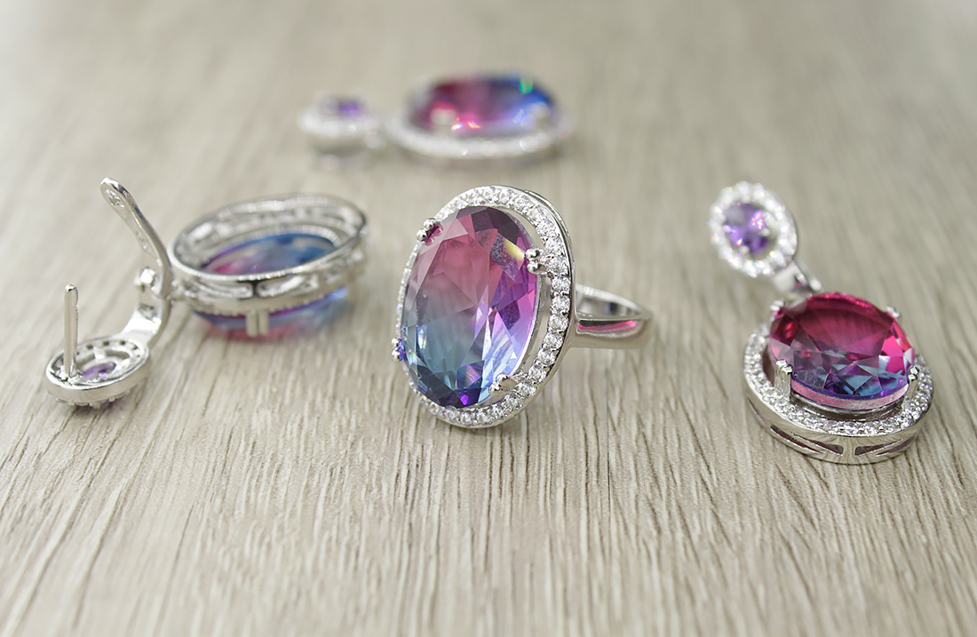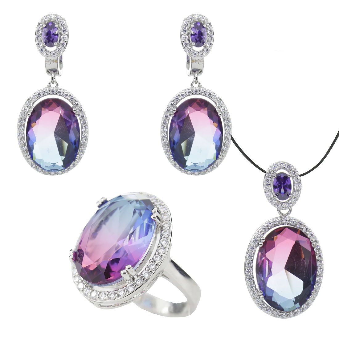 Полный комплект с крупным фианитом "турмалин" фиолетово - голубого цвета, состоящий из кольца, сережек и подвески. Размер камня в серьге: 13х18мм, размер серьги с застежкой: 40мм. Размер камня в кольце: 13х18мм. Размер камня в подвеске 13х18, размер подвески целиком 33мм