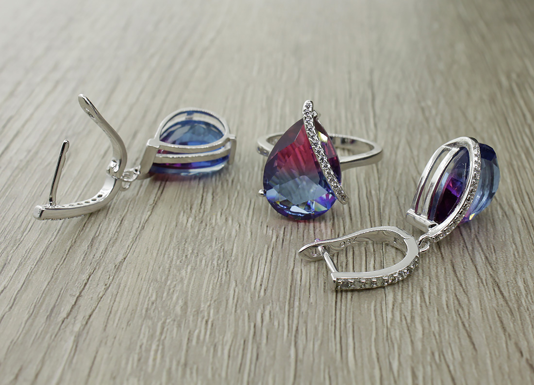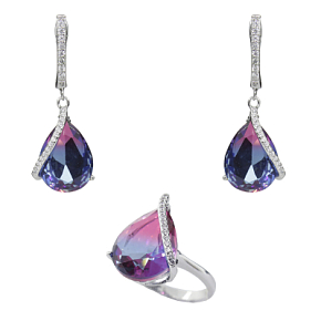 Нежный и женственный комплект с фианитом "турмалин" фиолетово- голубого цвета. Размер камня в серьге: 11х17мм, размер серьги с застежкой: 39мм. Размер камня в кольце: 11х15мм.