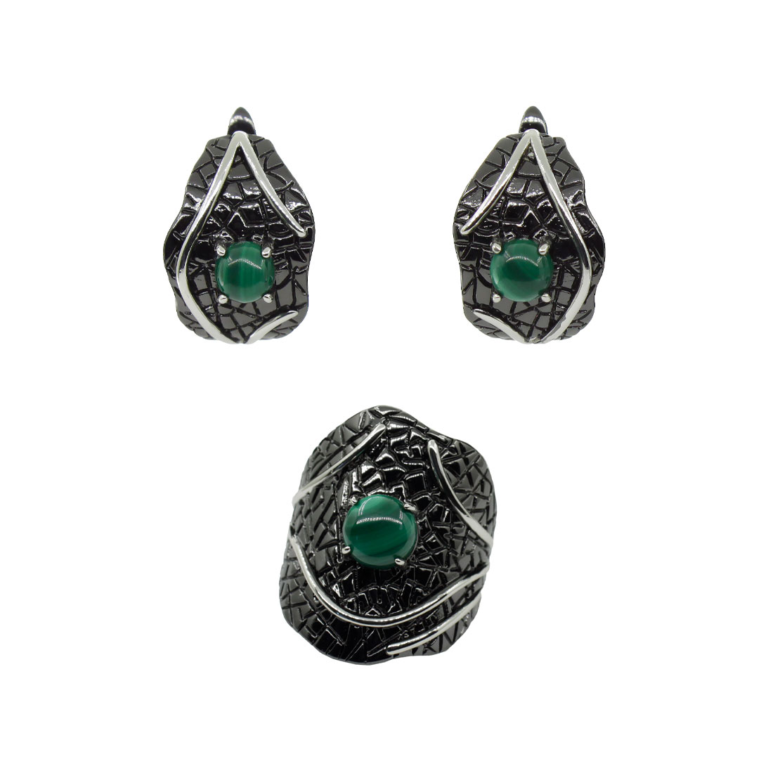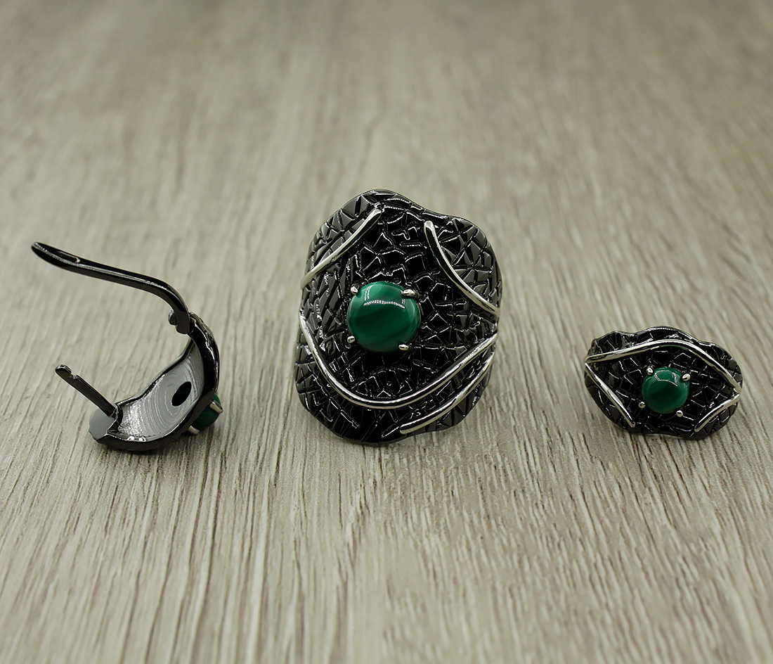 Стильный комплект с натуральным малахитом и качественным покрытием. Диаметр камня в серьге: 5мм, размер серьги с застежкой: 18мм. Диаметр камня в кольце: 8мм.