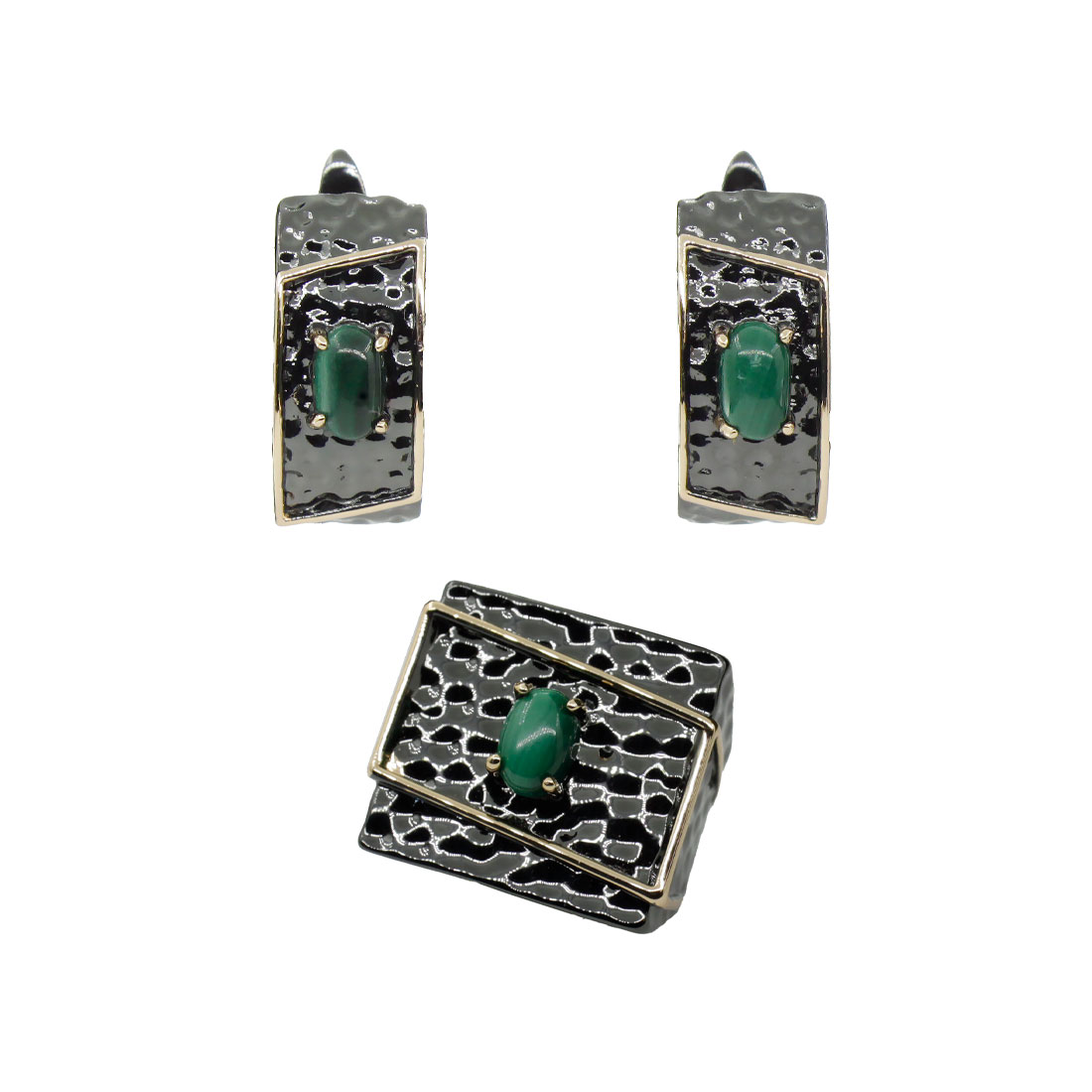 Стильный комплект с натуральным малахитом и качественным покрытием. Размер камня в серьге: 4x6мм, размер серьги с застежкой: 18мм. Размер камня в кольце: 5x7мм.