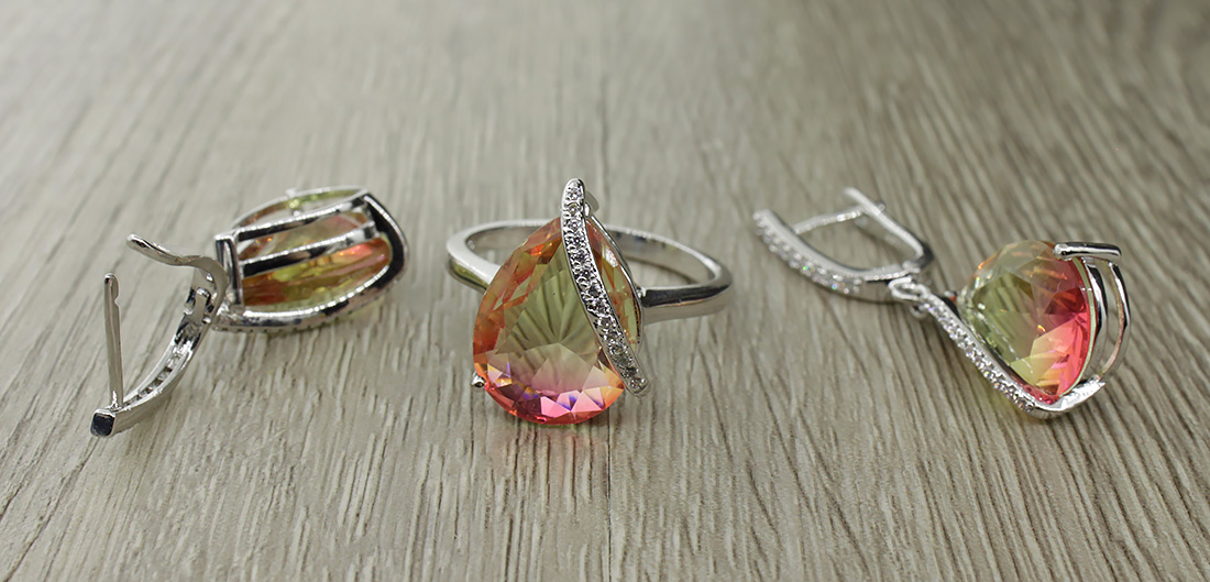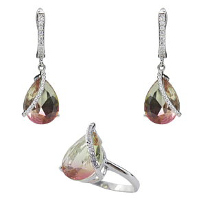 Нежный и женственный комплект с фианитом "турмалин" желто-красного цвета. Размер камня в серьге: 11х17мм, размер серьги с застежкой: 39мм. Размер камня в кольце: 11х15мм.