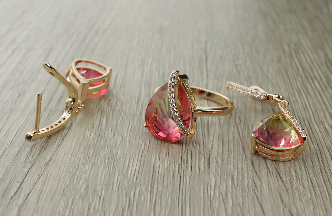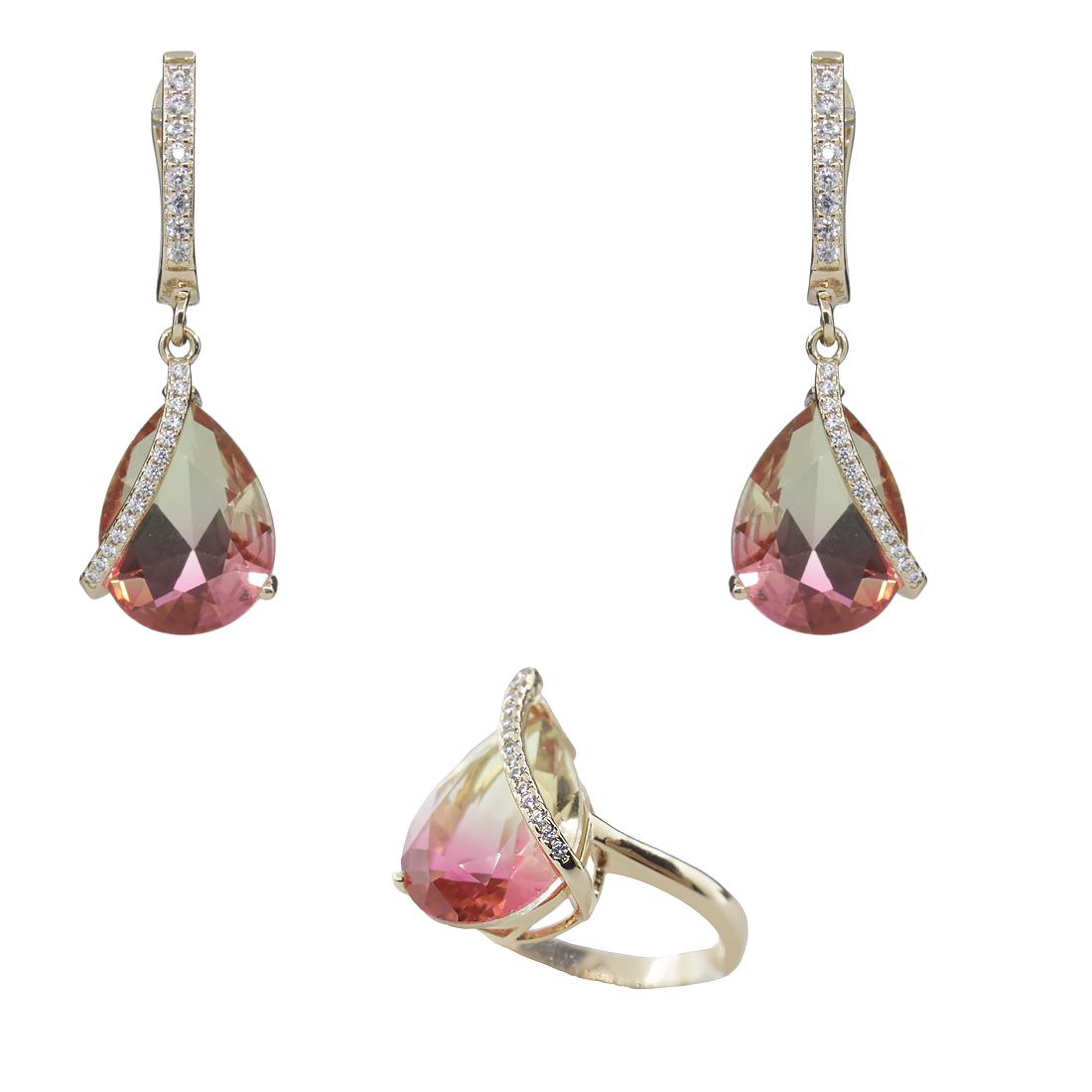 Нежный и женственный комплект с фианитом "турмалин" желто-красного цвета. Размер камня в серьге: 11х17мм, размер серьги с застежкой: 39мм. Размер камня в кольце: 11х15мм.