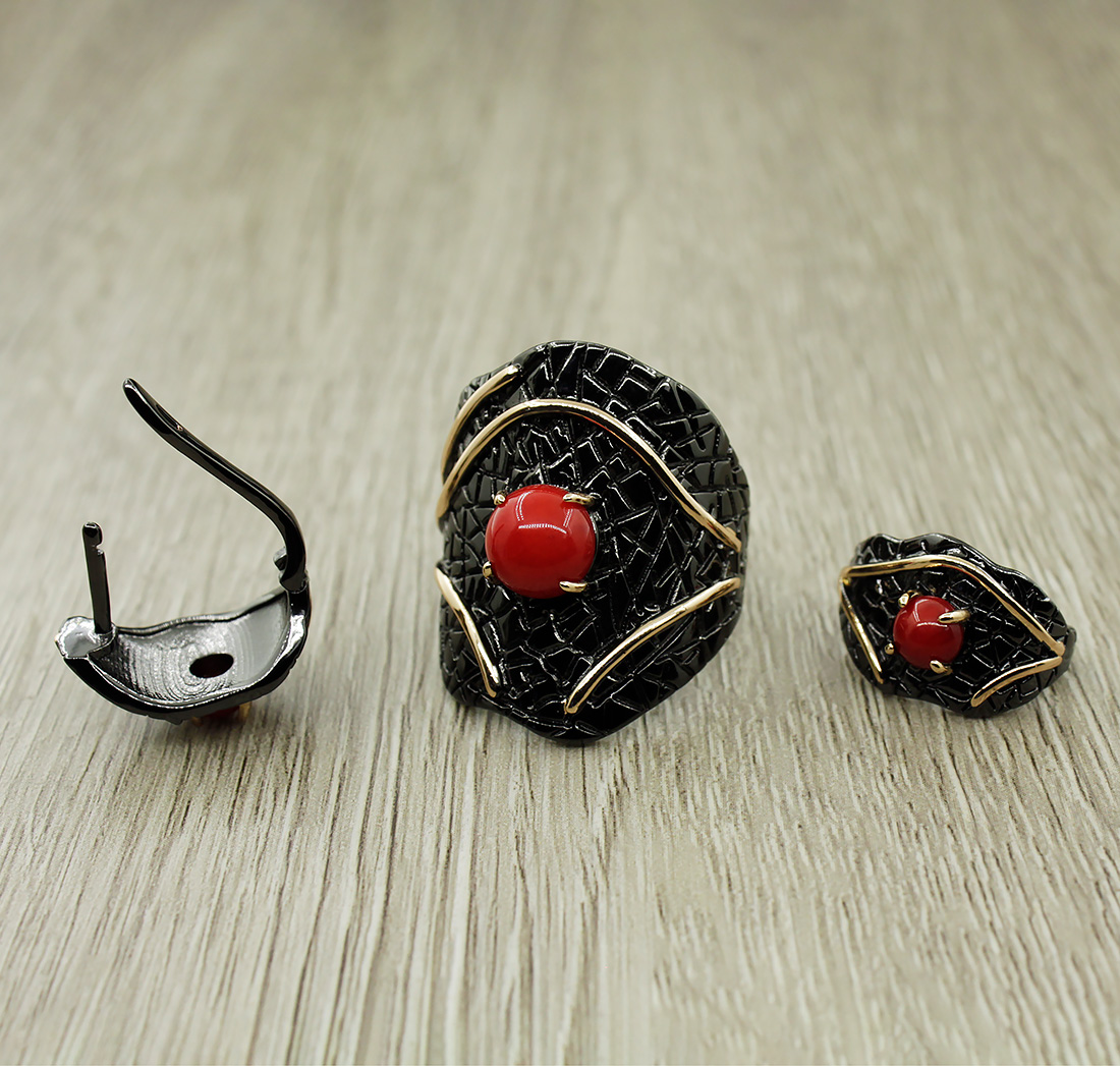Яркий комплект с натуральным кораллом и качественным покрытием. Диаметр камня в серьге: 5мм, размер серьги с застежкой: 18мм. Диаметр камня в кольце: 8мм.