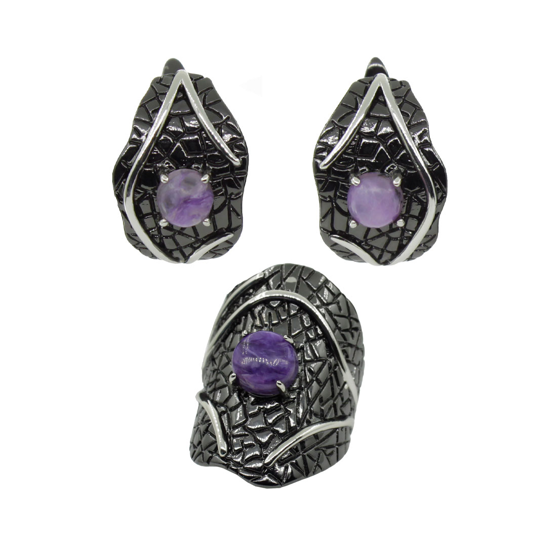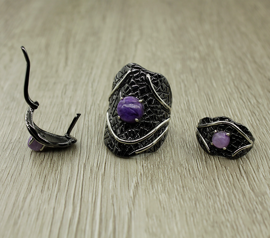 Манящий комплект с натуральным чароитом и качественным покрытием. Диаметр камня в серьге: 5мм, размер серьги с застежкой: 18мм. Размер камня в кольце: 8мм.