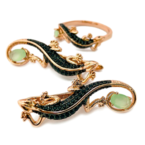 Комплект "Ящерки", фианит цвета "зеленый", покрытие под золото, размеры кольца:17, 18, 19, 20