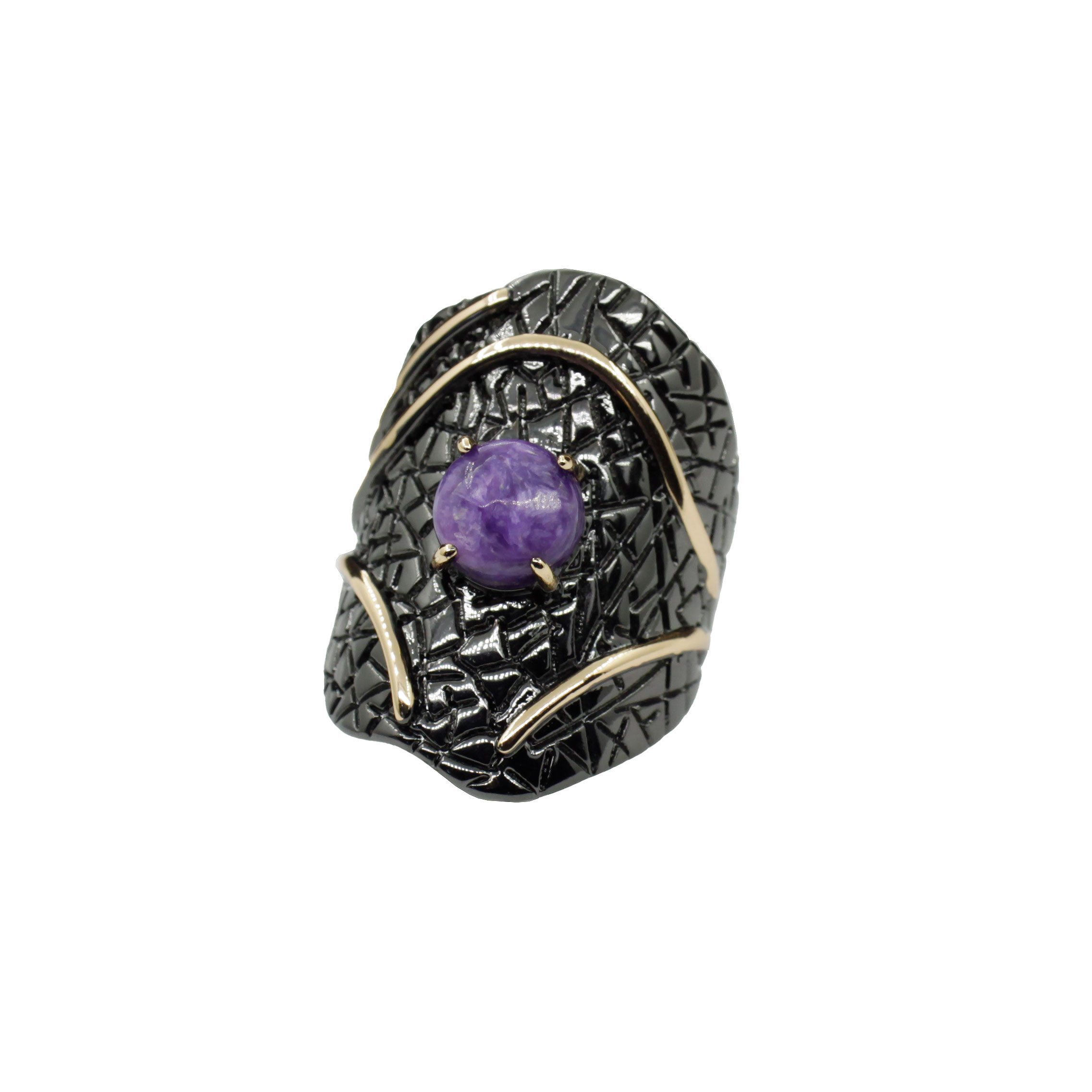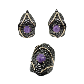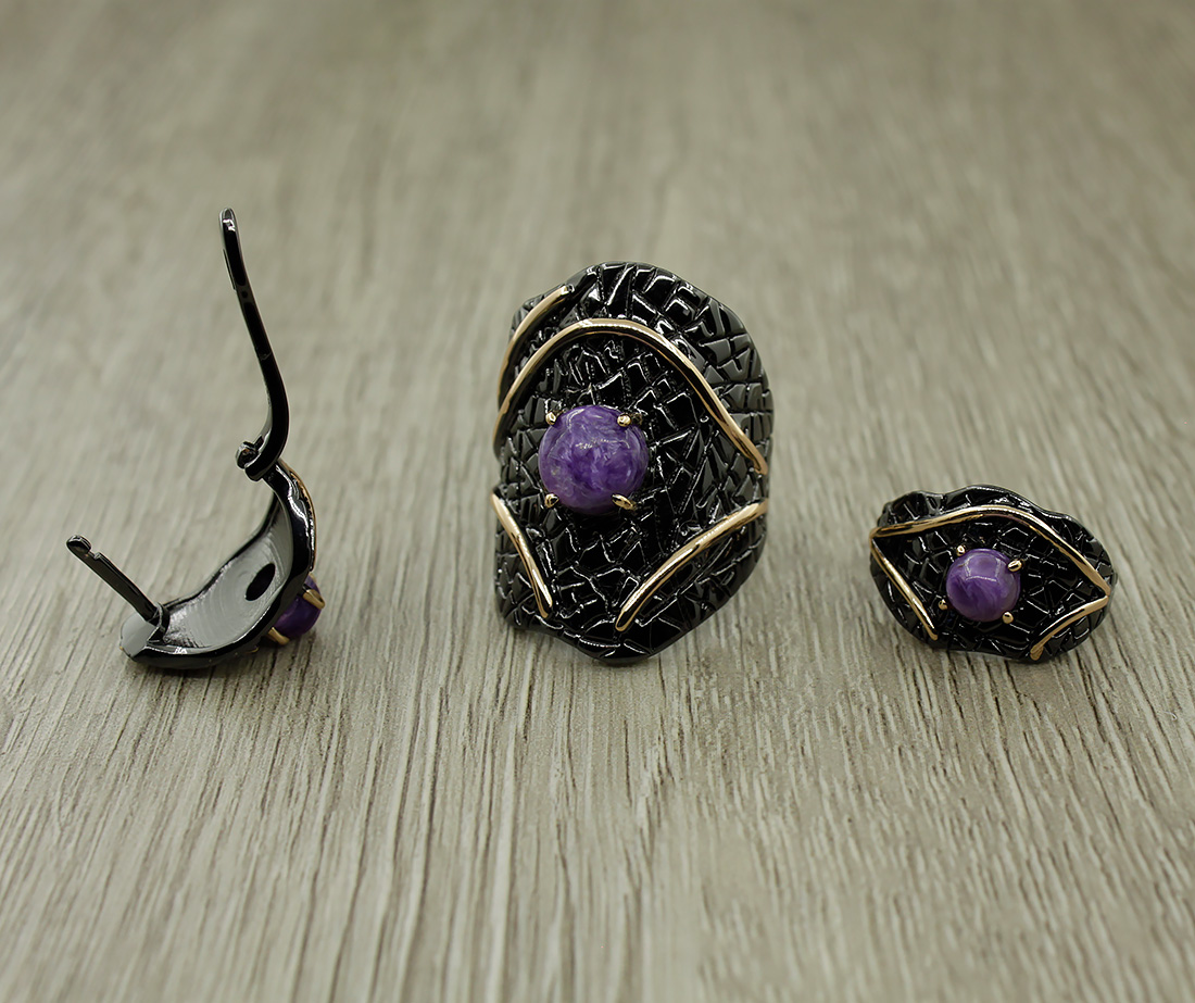 Манящий комплект с натуральным чароитом и качественным покрытием. Диаметр камня в серьге: 5мм, размер серьги с застежкой: 18мм. Диаметр камня в кольце: 8мм.